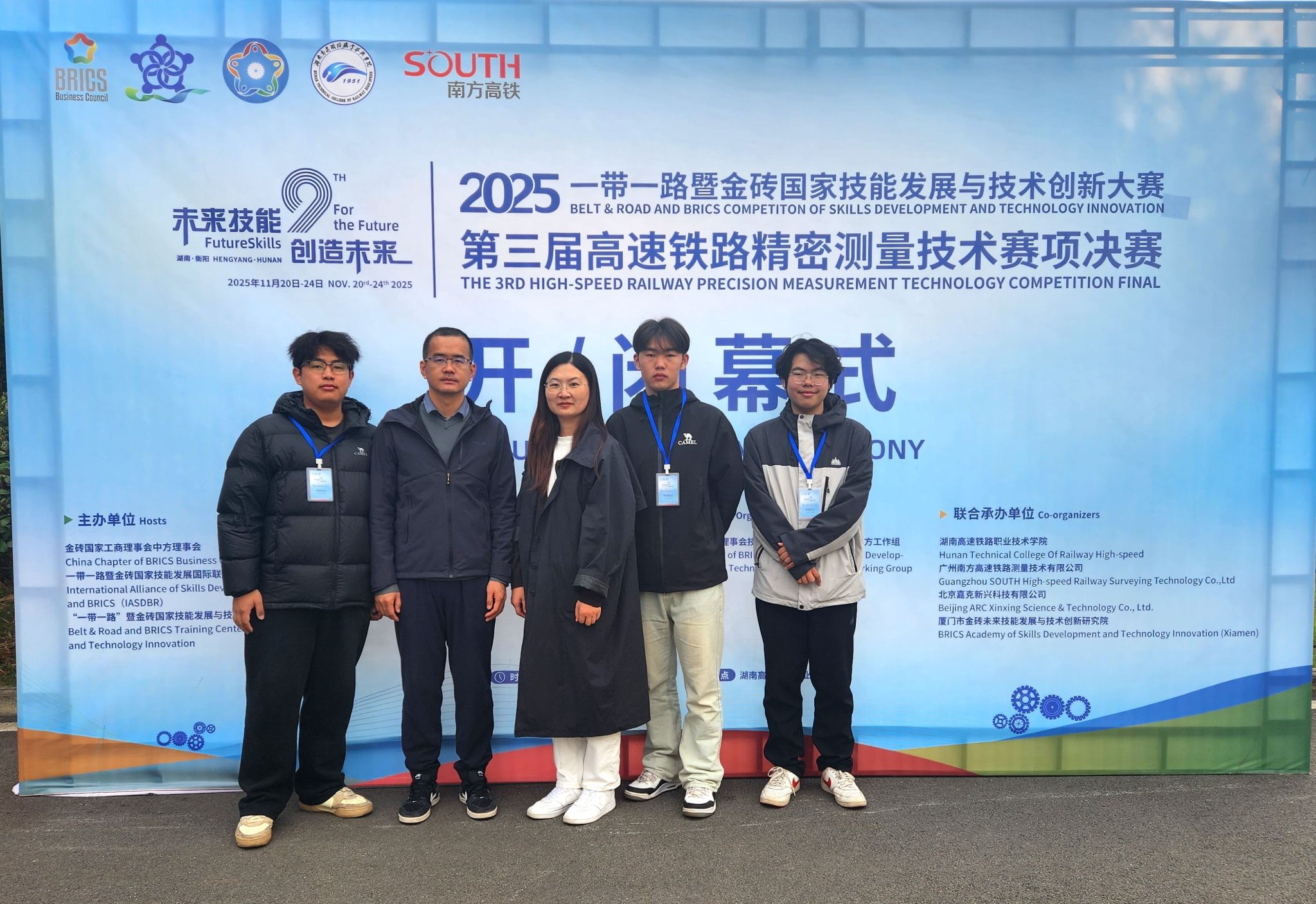 近日,2025“一带一路”暨金砖国家技能发展与技术创新大赛第三届高速铁路精密测量技术赛项决赛在湖南高速铁路职业技术学院举行,来自全国各地的65支代表队155名选手参赛。我校公路与铁道工程系蒲锐、陈子洋和唐镜博3名同学,在曹英浩老师和徐刚老师的悉心指导下,一路过关斩将、不惧挑战,最终斩获全国三等奖。