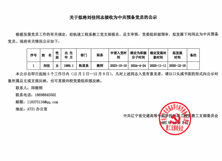 根据发展党员工作的有关规定,经轨道工程系教工党支部提名、总支审核,党委组织部预审,拟发展下列同志为中共预备党员。现将有关情况公示如下: