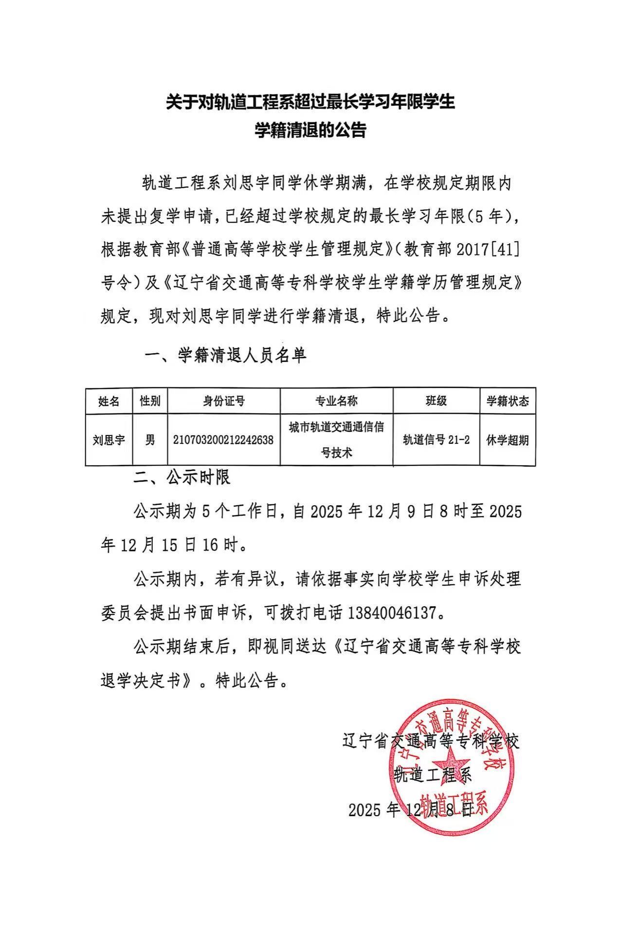 关于对轨道工程系超过最长学习年限学生学籍清退的公告