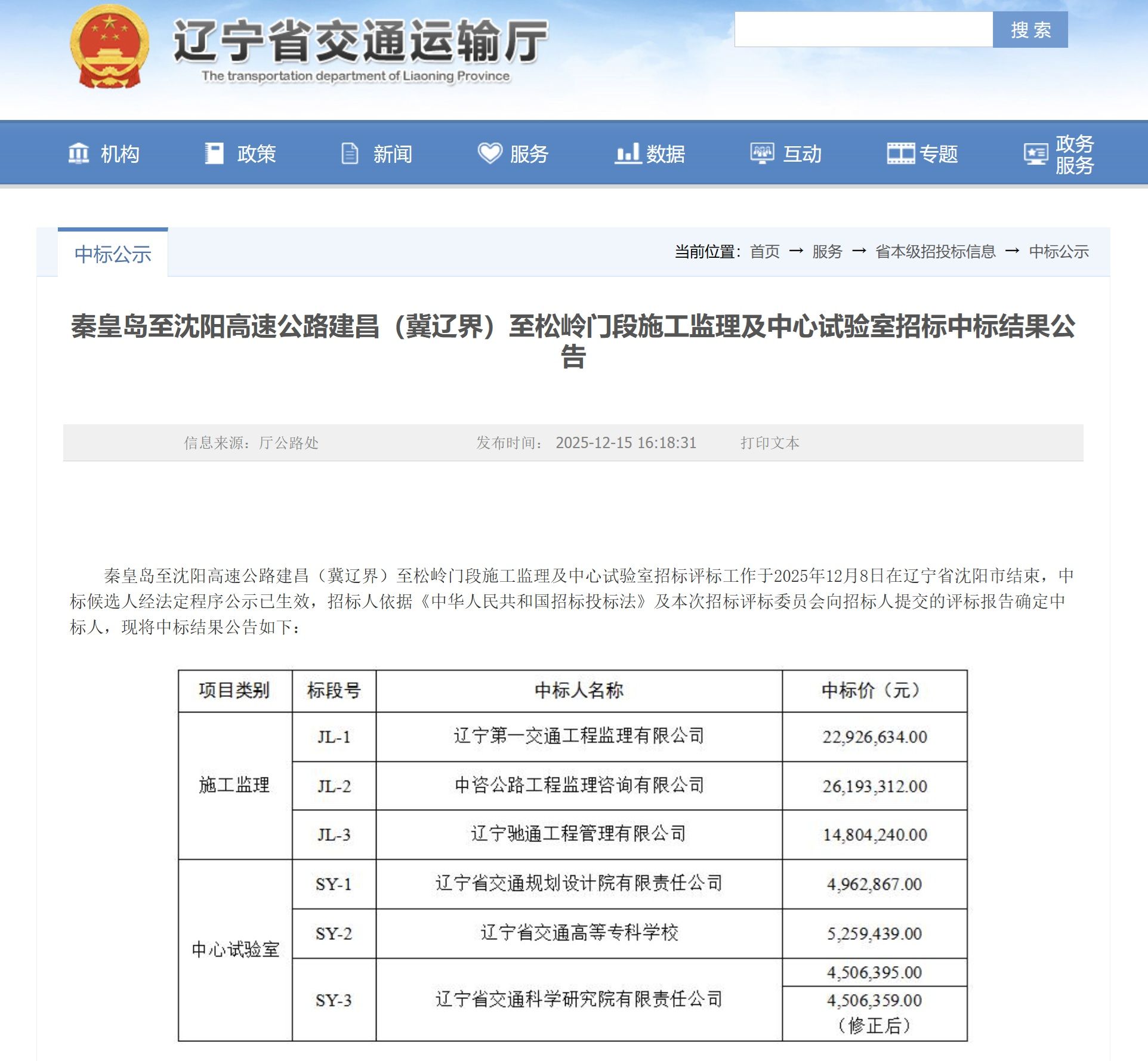 12月15日,我校检测实验中心凭借雄厚的技术实力与良好的行业信誉,成功中标辽宁省交通运输厅“秦皇岛至沈阳高速公路建昌(冀辽界)至松岭门段中心试验室项目”,承担该项目SY-2标段中心试验室的工作任务。