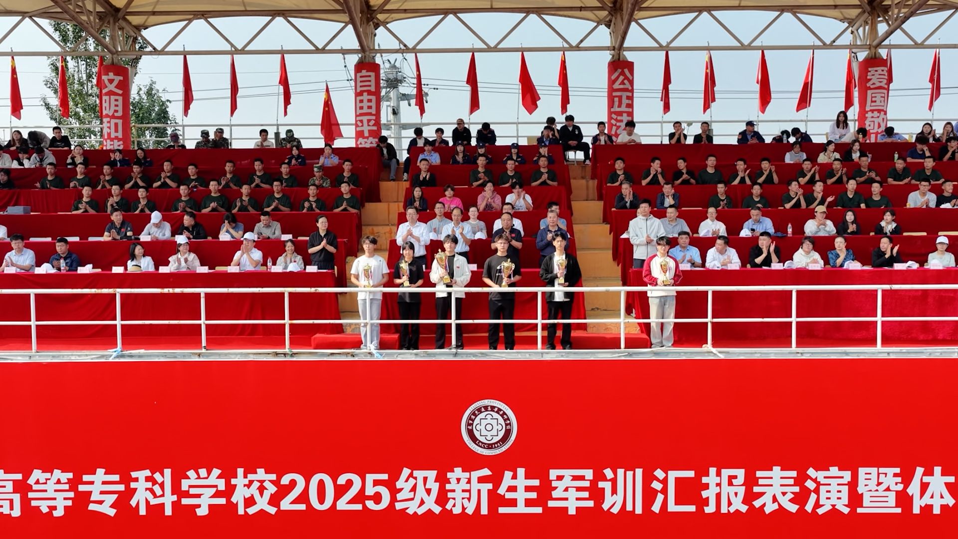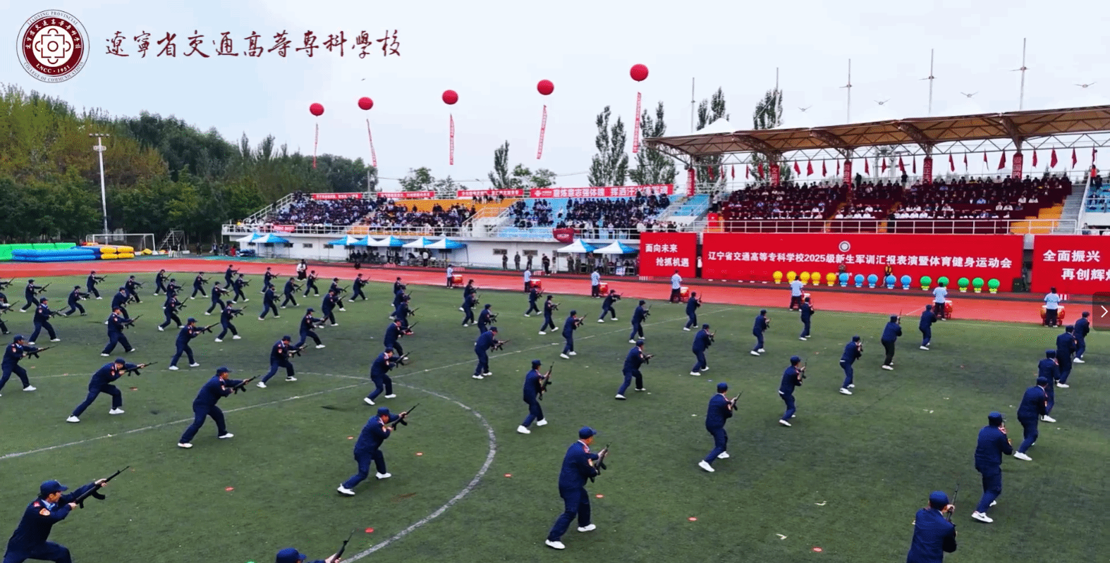 伴随着秋高气爽的好天气,沐浴着九月的暖阳,校长孙延鹏在主席台上隆重宣布辽宁省交通高等专科学校新生军训汇报表演暨2025年体育健身运动会开幕!