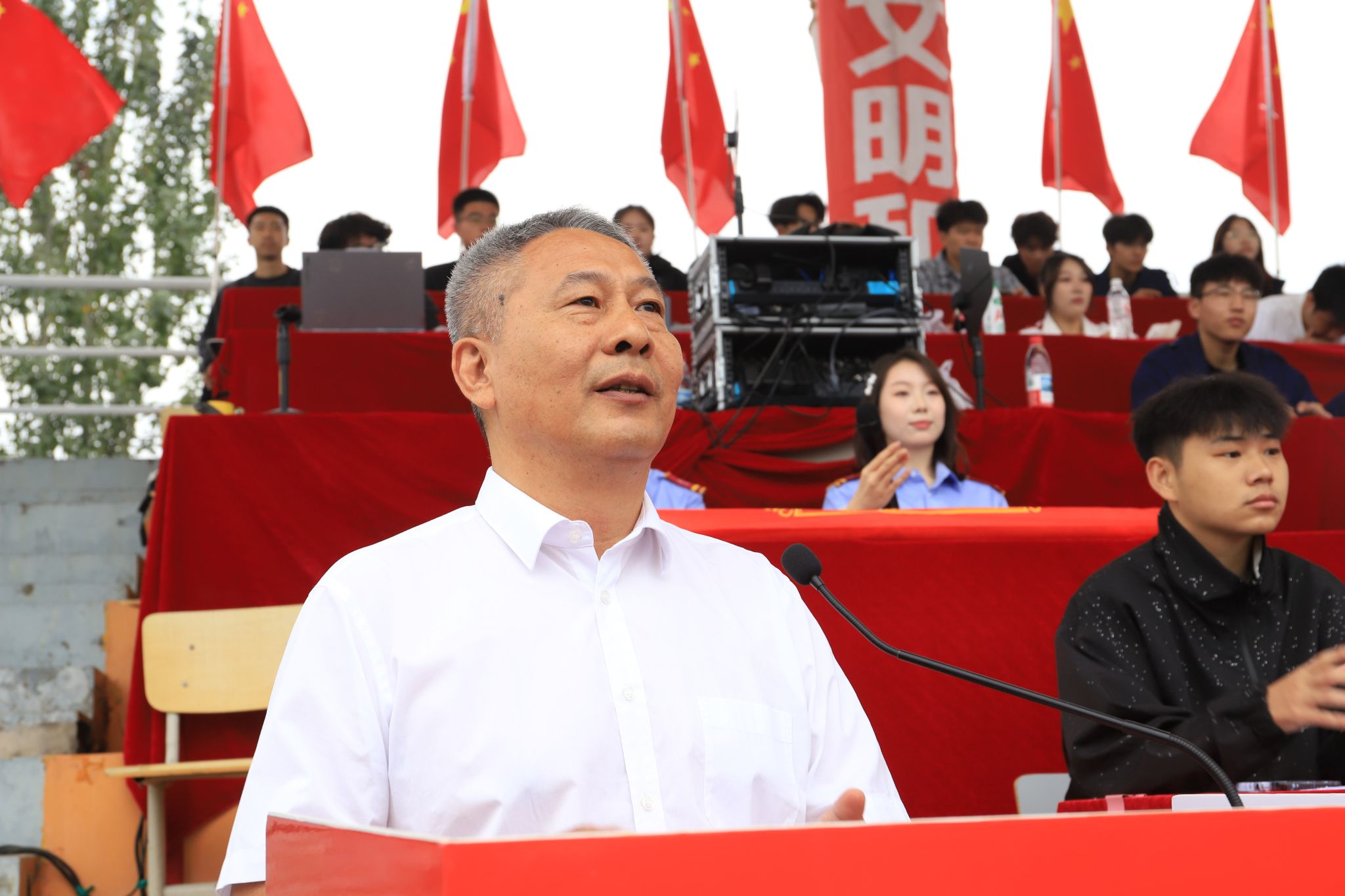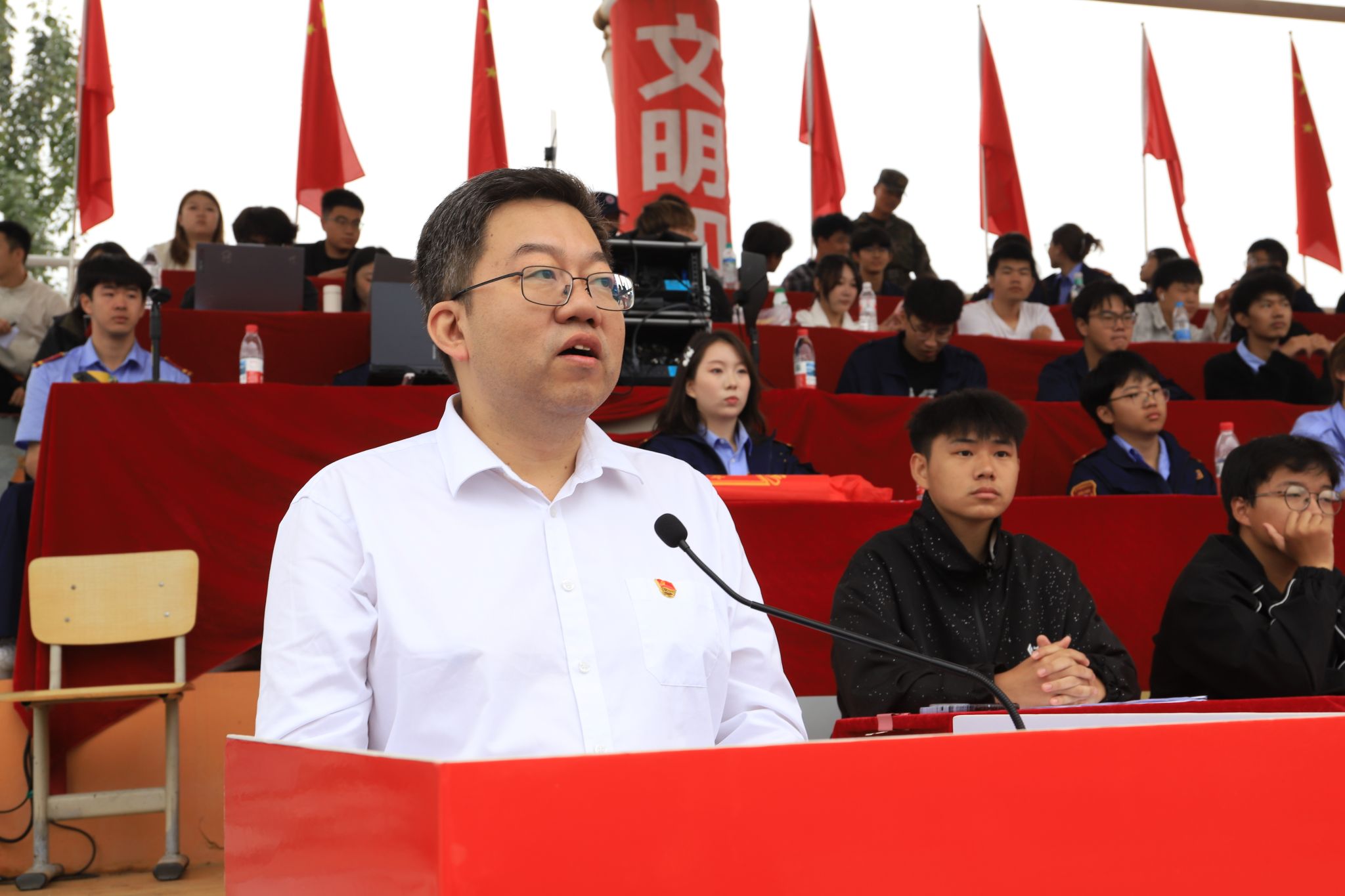 他向全体新同学提出三点希望:一是将个人理想融入家国情怀。二是牢固树立规矩意识。三是尽快实现身份转变。希望全校师生以此次军训为新的起点,铭记历史、砥砺本领,把个人成长融入民族复兴的伟大征程,讲好党的故事、革命的故事、英雄的故事,让红色基因薪火相传,在强国建设、民族复兴的伟业中书写无悔青春!