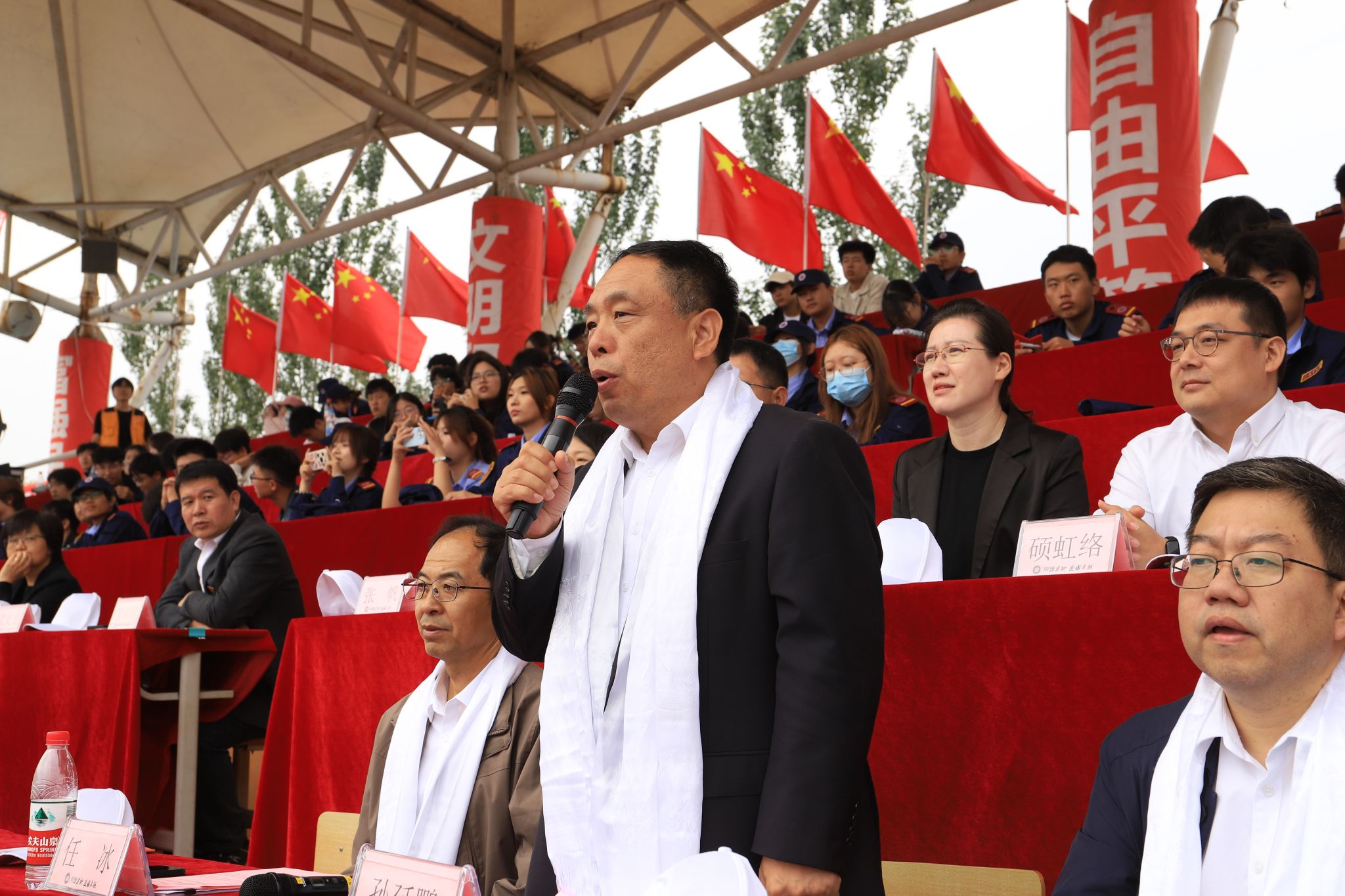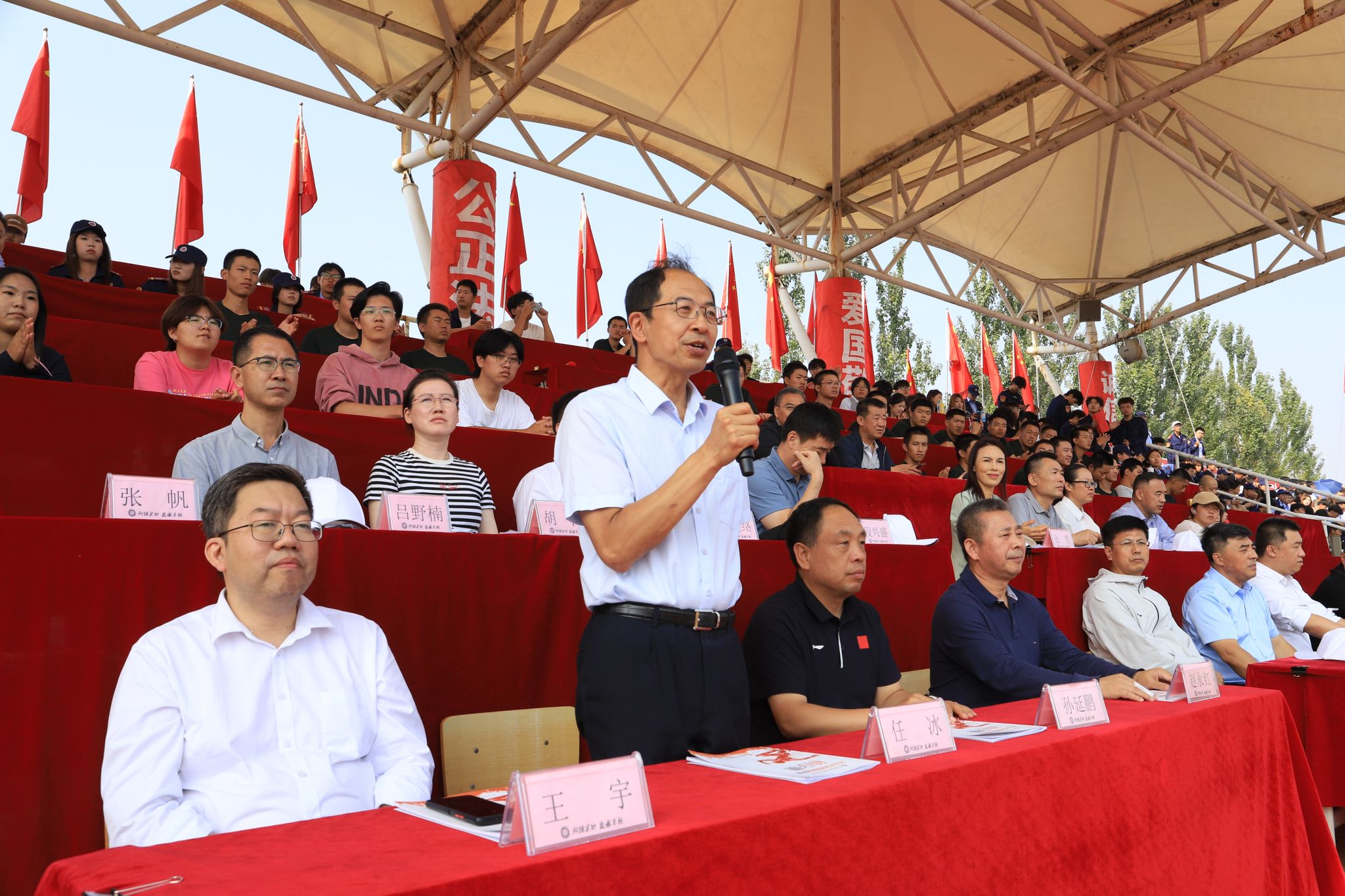 党委书记任冰发表讲话,他代表学校党委,向为军训工作付出辛勤努力的部队全体教官,表示诚挚的感谢!向圆满完成军训任务的同学,致以衷心的祝贺!