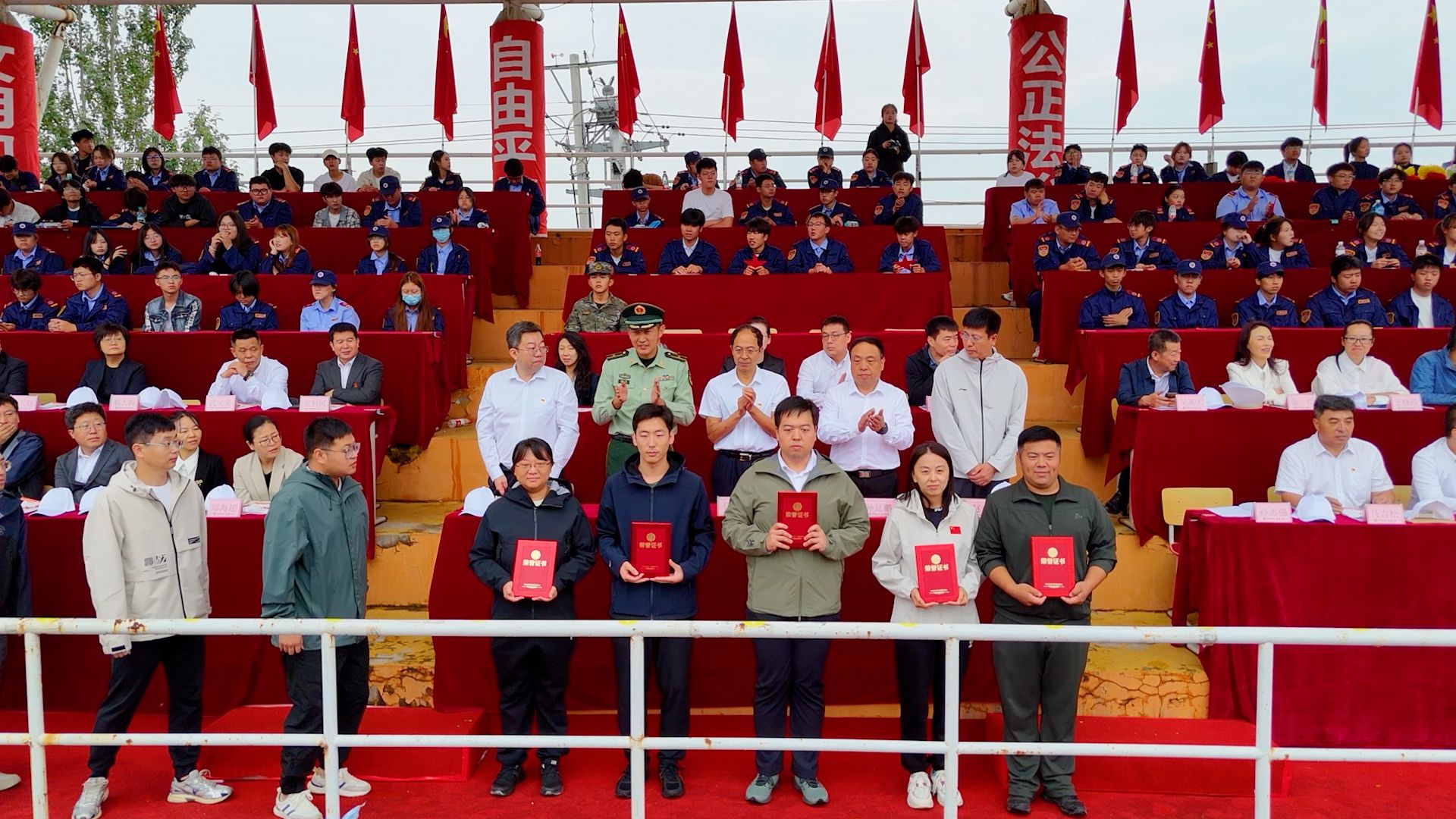 国旗护卫队英姿飒爽、步履铿锵,护送中华人民共和国国旗入场。鲜艳的五星红旗冉冉升起,全场奏唱国歌,大会正式开始。首先进行新生军训汇报表演。受阅队伍由各教学系和警士管理学院推选出的10支优秀专业方队及1支女子方队组成。同学们以洪亮的口号与军姿作礼,精神抖擞、步伐整齐,依次走过主席台接受检阅,那一阵齐过一阵的踏步声,熔铸成青春最完美的交响。由女学员表演的女子匕首操表演,动作整齐、步调一致、精神焕发、意志昂扬,宛如坚不可摧的钢铁长城。由男学员表演的男子刺杀操,以刚劲的姿态、铿锵的动作,把青春的热血与阳刚展现得淋漓尽致。由警士生完成擒敌震脚功擒敌动作表演,如猛虎蓄势、锐气逼人,震脚铿锵稳底盘似惊雷撼地,擒敌干脆显硬功如利刃出鞘。