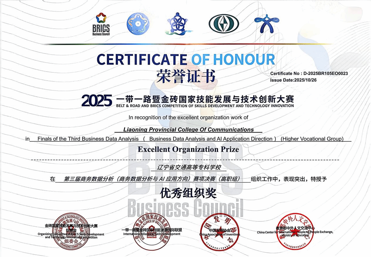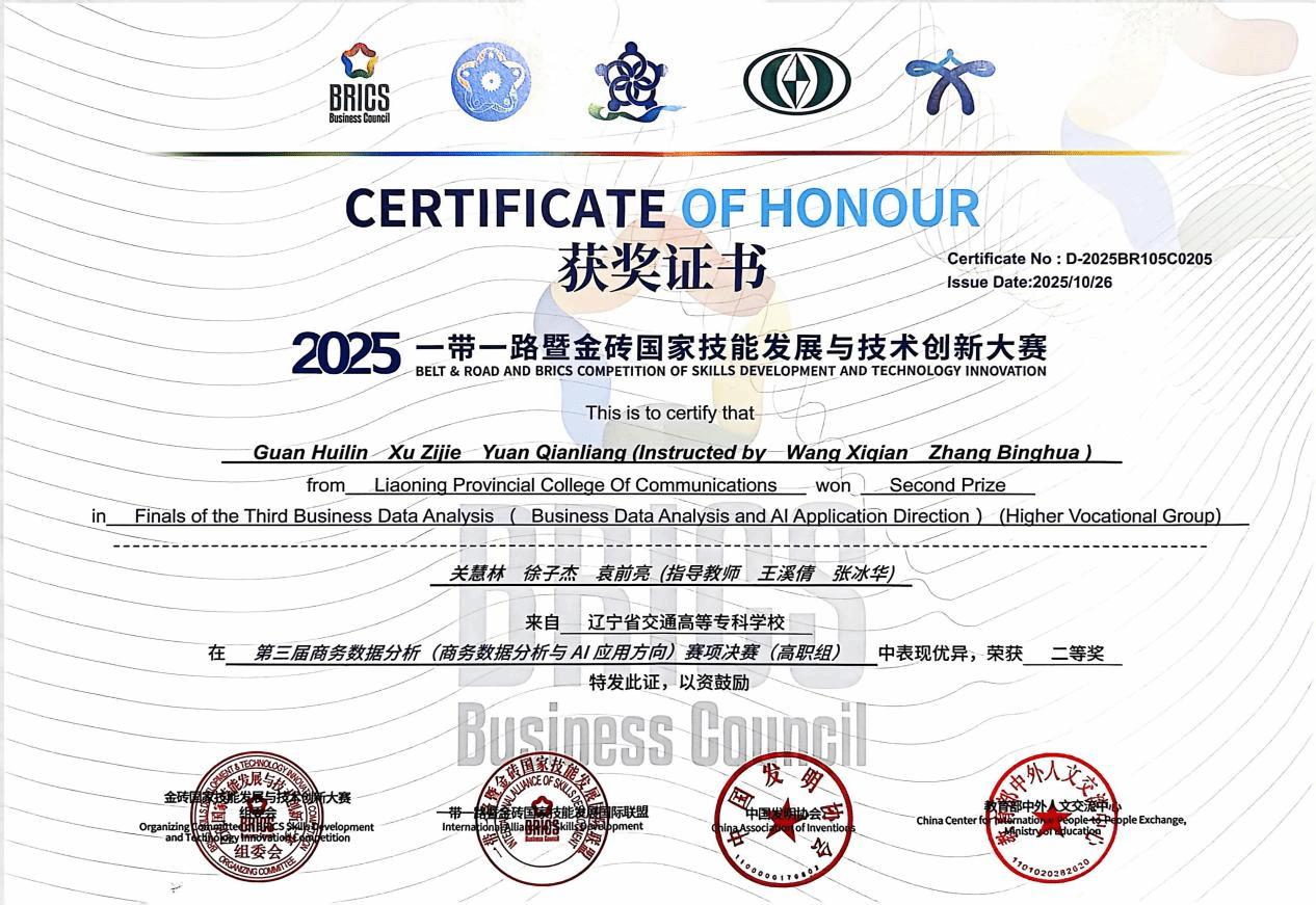 近日,2025一带一路暨金砖国家技能发展与技术创新大赛之第三届商务数据分析(商务数据分析与AI应用方向)赛项全国总决赛(高职组)圆满落幕。我校物流管理系组建的参赛团队,在全国百余支强劲队伍的激烈角逐中脱颖而出,最终斩获全国总决赛二等奖,王溪倩、张冰华两位老师获评“优秀指导教师”,学校获评“优秀组织奖”,用实力书写了职业教育育人成效的亮眼答卷。