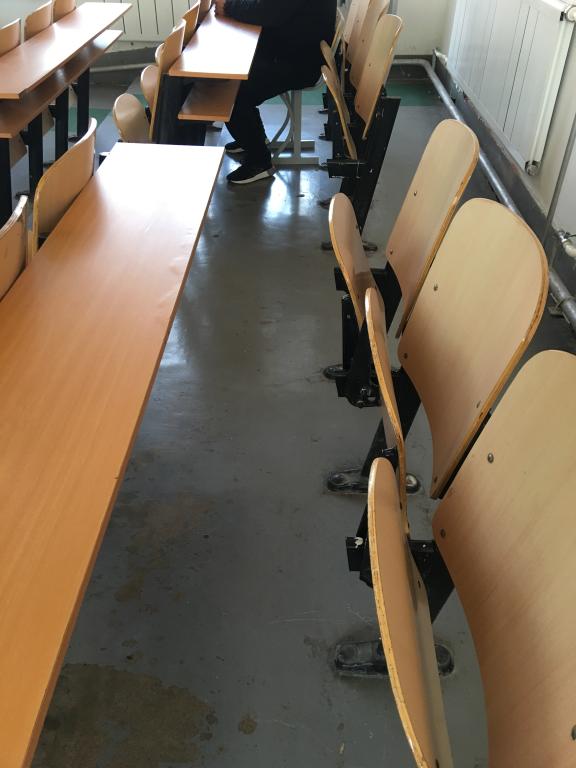 (1)知行楼东合阶梯教室学生座席坐下有响声(图5),上学期后勤公司已经进行了处理,但经过几个月后仍有部分座椅坐下有响声影响教师授课效果。同时很多座椅坡度很大,坐下后人体前倾,感觉不舒服,很多学生从教室拿椅子来坐,造成学生教室缺少椅子情况比较严重。