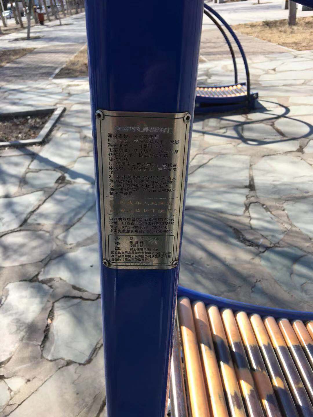 (3)其他几个问题:北院水泵房铁板生锈严重(图19);北院理发店没有安全负责人标志;休闲广场的体育器材超过使用年限(图20),存在安全隐患。