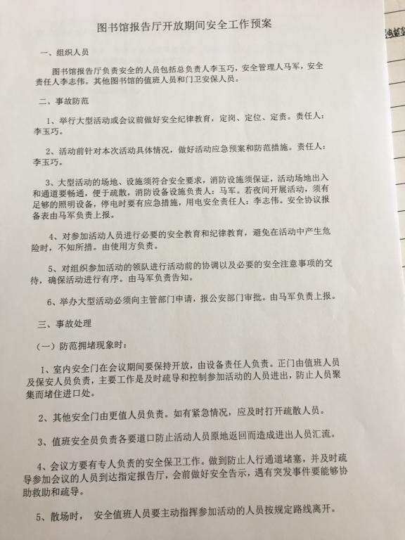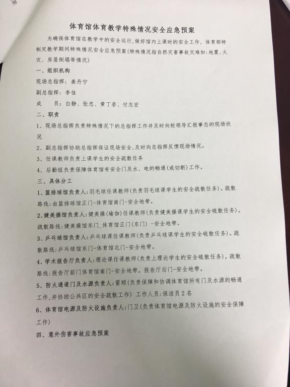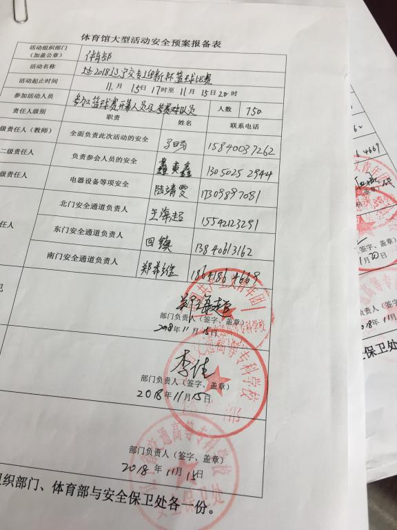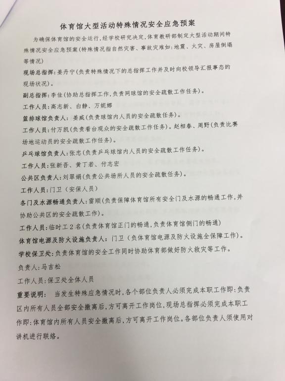 1.体育馆开放与安全有关的系列情况。(1)体育馆值班人员即门卫归属保卫处,有较详细的工作记录。值班出现问题第一时间要求向保卫处报告。有出现重大事项报告程序、预案(图3-4)。(2)场馆大型活动超过80人必须签报备表(学生少于80人不予批准)(图5),要求活动要有教师跟随(否则不予批准),同时报安全保卫处备案,有安全预案和活动记录(图6)。个别教师随机的入馆活动也有备案记录(图7)。