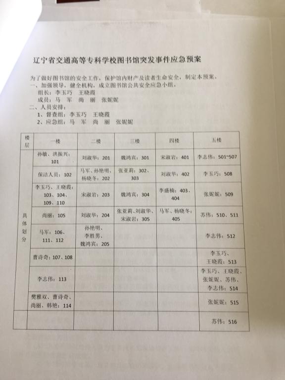 (1)图书馆有二套值班情况记录,包括保卫处管理的安保人员的值班情况记录,同体育馆一样,较详细和全面。一套是图书馆开放期间,图书馆人员的值班记录,对学生入馆高峰期间的人员引导、对使用图书馆期间出现的问题咨询、以及对突发事件的处理等,有较详细的要求、程序和记录单(图10)。由图书馆办公室汇总。