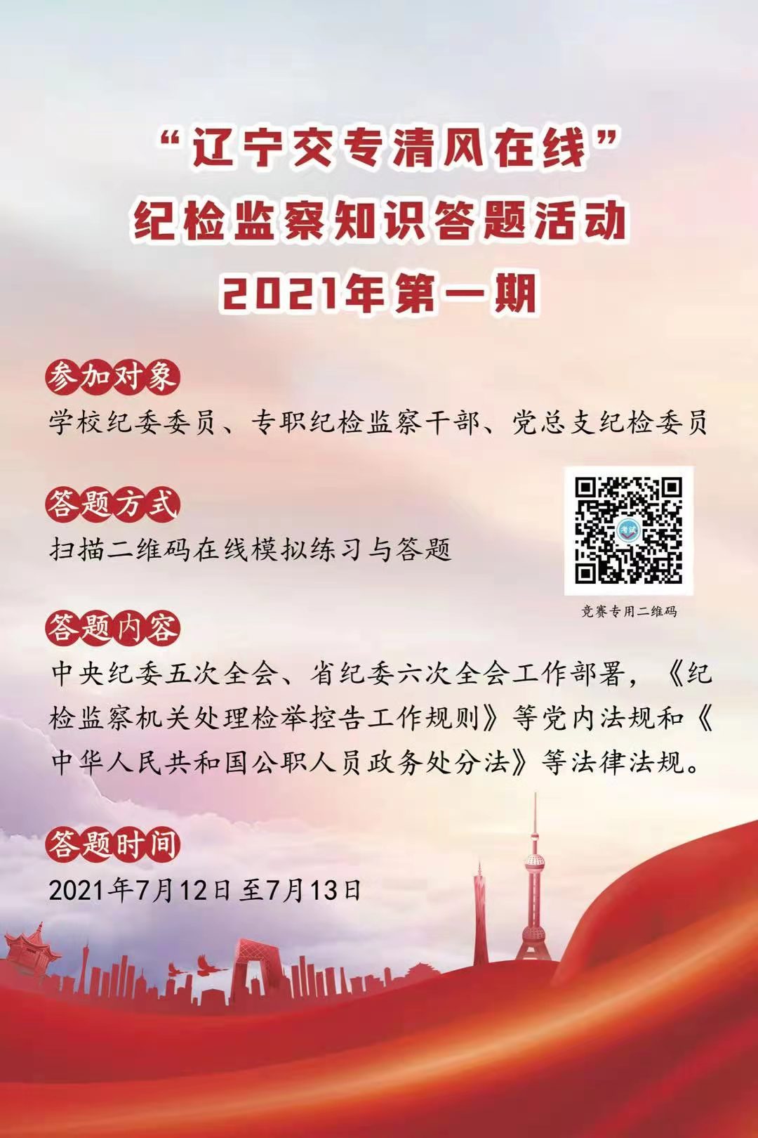 为深入学习贯彻中央纪委五次全会、省纪委六次全会精神,掌握好《纪检监察机关处理检举控告工作规则》《中华人民共和国公职人员政务处分法》等法律法规,提升纪检监察干部队伍素质,学校纪委决定,在全校专兼职纪检监察干部中开展“辽宁交专清风在线”纪检监察知识答题活动2021年第一期。