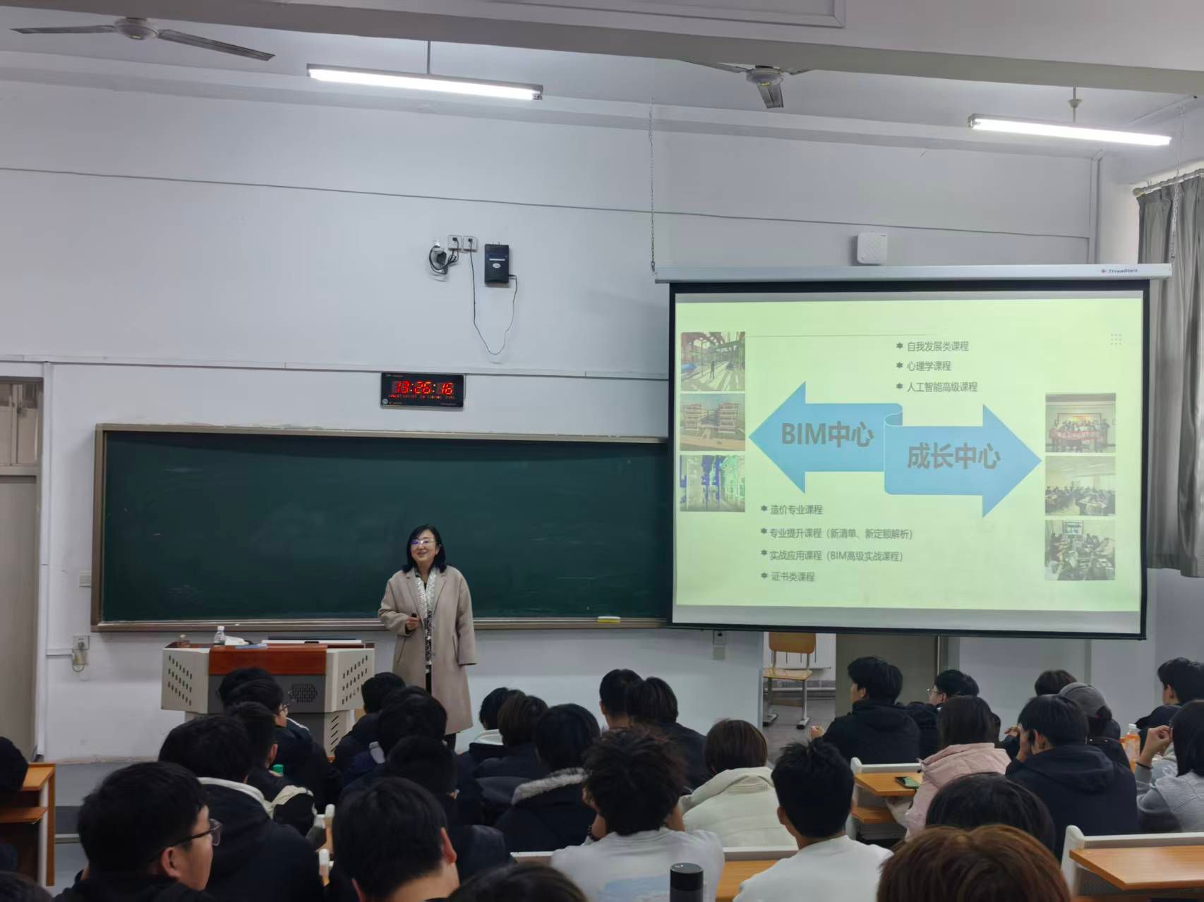 为深化产教融合,拓宽学生专业视野,让学生零距离了解行业前沿动态,2025年11月5日,学校建筑工程系特邀沈阳认臻信息科技有限公司的总经理文晓琳女士,为2025级智能建造专业学子带来了一场题为“智能建造的探索与BIM案例分享”的精彩学术报告。报告会现场座无虚席,气氛热烈。