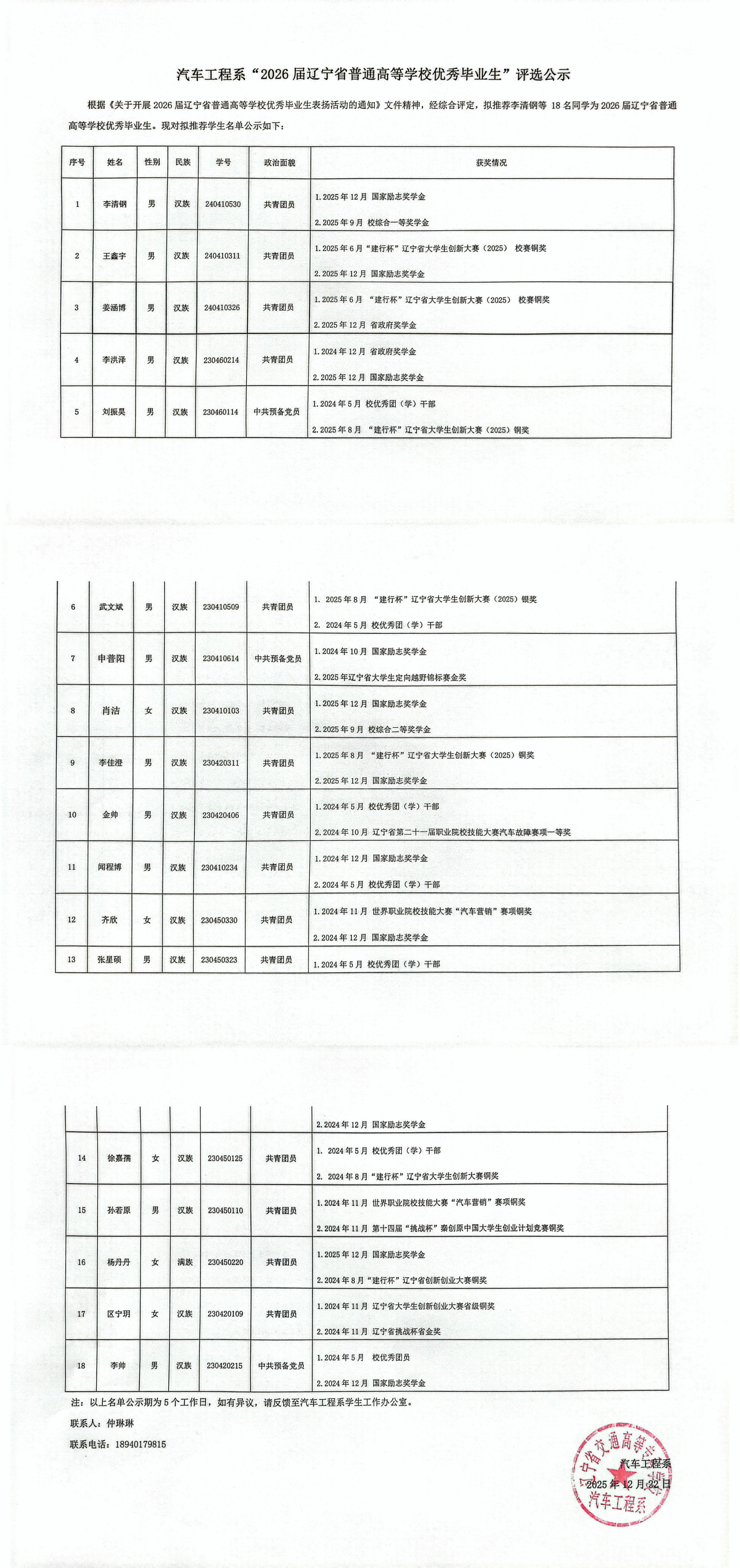 汽车工程系“2026届辽宁省普通高等学校优秀毕业生”评选公示