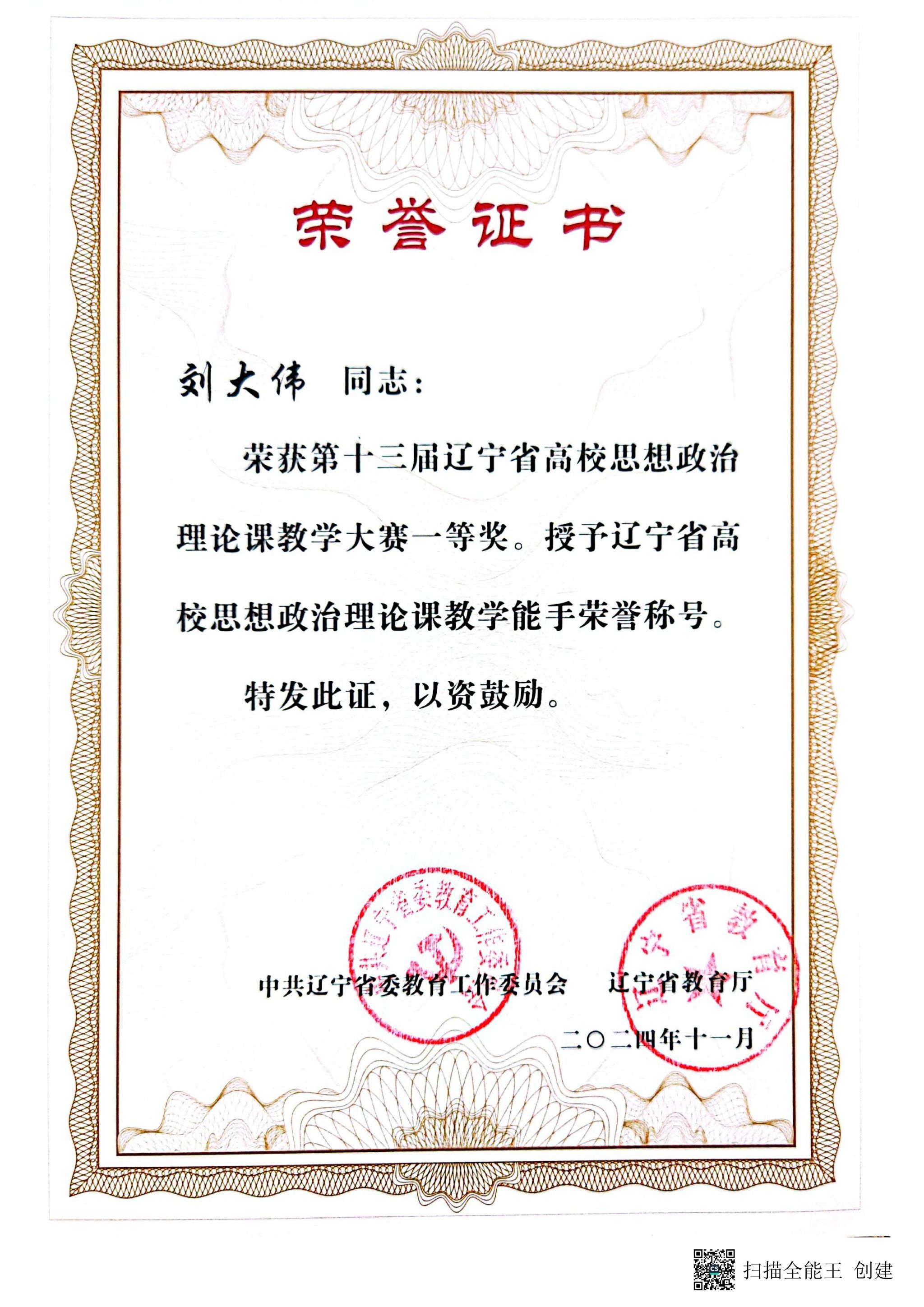 教学成果 当前位置: 首页 > 教学工作 > 教学成果 > 正文 第十三届辽宁省高校思想政治理论课教学大赛 发布时间:2025-12-08 18:58 浏览量: 教师姓名:刘大伟项目名称(赛项全称):第十三届辽宁省高校思想政治理论课教学大赛获奖等级:省级一等奖主办单位(盖章单位):辽宁省教育厅获奖日期(年月):2024年11月成果佐证: 上一条:第十届辽宁省高校思想政治理论课教学大赛 下一条:第十届辽宁省高校思想政治理论课教学大赛