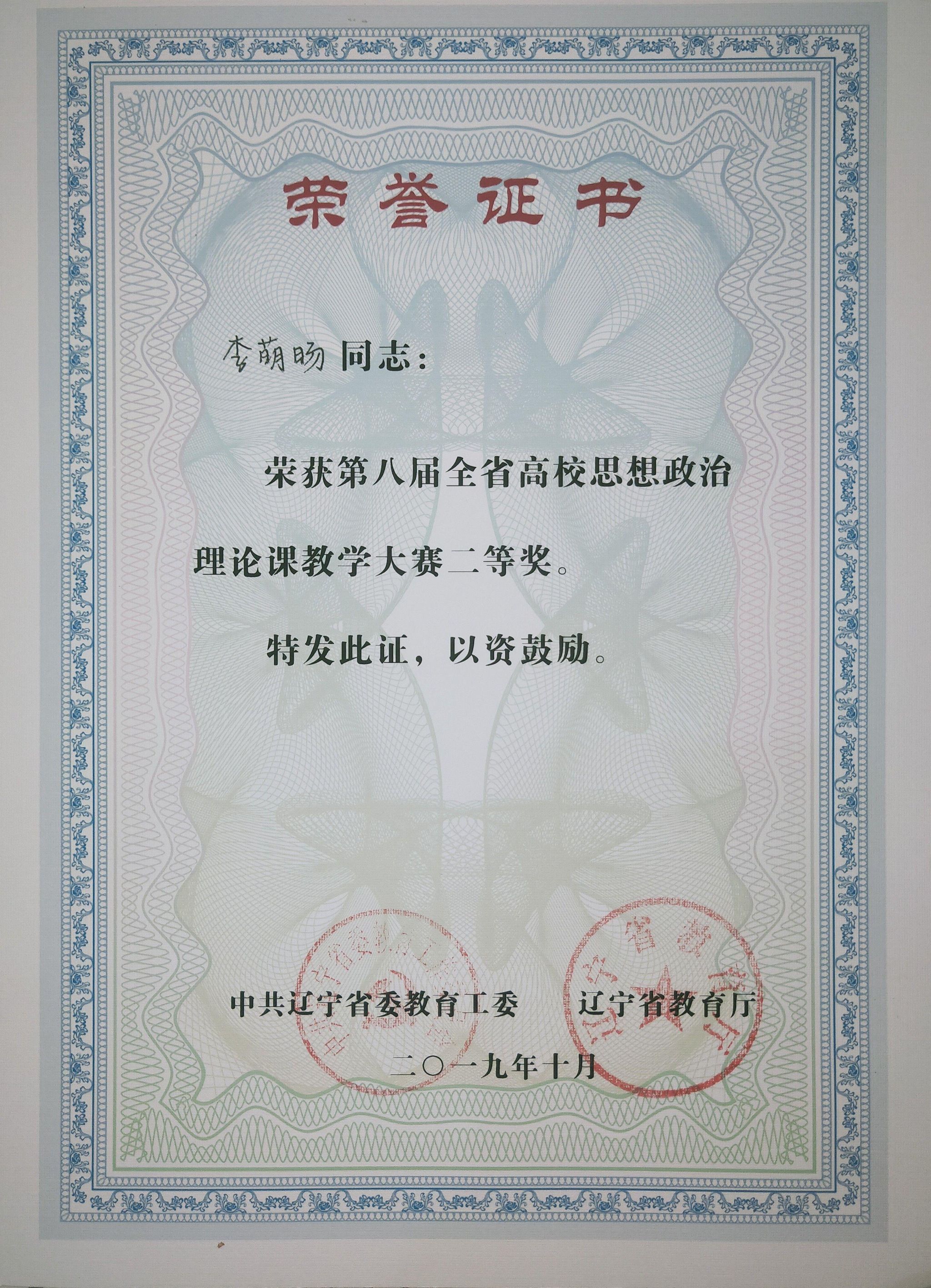 教学成果 当前位置: 首页 > 教学工作 > 教学成果 > 正文 第八届辽宁省高校思想政治理论课教学大赛 发布时间:2025-12-08 19:01 浏览量: 教师姓名:李萌旸项目名称(赛项全称):第八届辽宁省高校思想政治理论课教学大赛获奖等级:省级二等奖主办单位(盖章单位):中共辽宁省委教育工委 辽宁省教育厅获奖日期(年月):2019年10月成果佐证: 上一条:第十四届辽宁省高校思想政治理论课教学大赛 下一条:第八届辽宁省高校思想政治理论课教学大赛