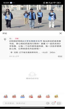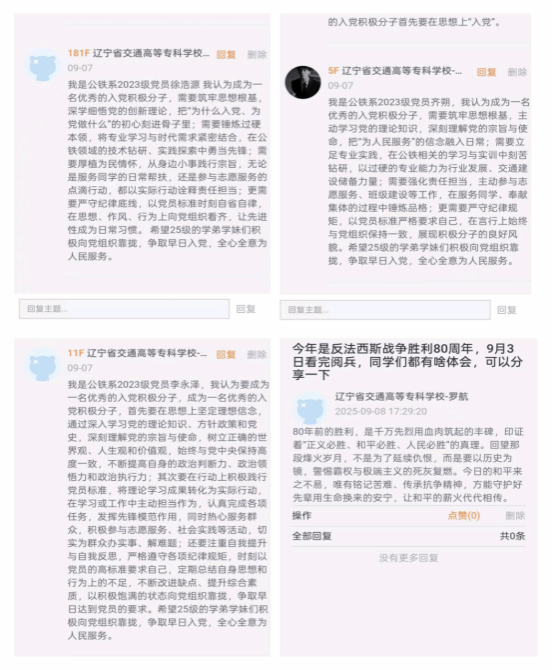 依托易班软件开设红色教育专题讨论区,围绕中国人民抗日战争暨世界反法西斯战争胜利80周年“你觉得如何成为一名优秀的入党积极分子”等主题发起互动讨论,管理员实时筛选优质发言进行置顶展示,组织学生围绕热点观点展开深度交流,使同学们在交流中深化对革命精神的理解,提升运用网络传递正能量的意识。
