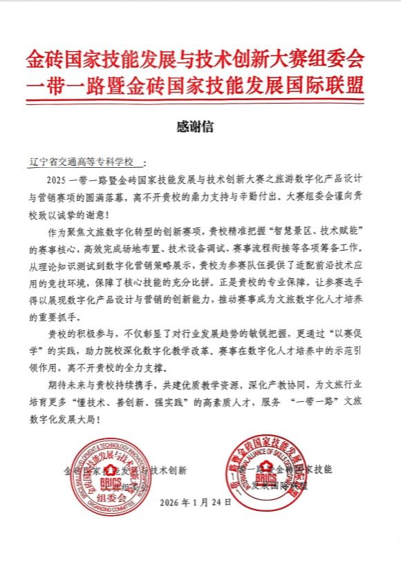 近日,金砖国家技能发展与技术创新大赛组委会、一带一路暨金砖国家技能发展国际联盟向我校发来感谢信,感谢我校管理工程系对“2025年一带一路暨金砖国家技能发展与技术创新大赛之旅游数字化产品设计与营销赛项”承办工作的鼎力支持与辛勤付出。 初审初校:周宇复审复校:孙莹 崔剑生终审终校:许迪