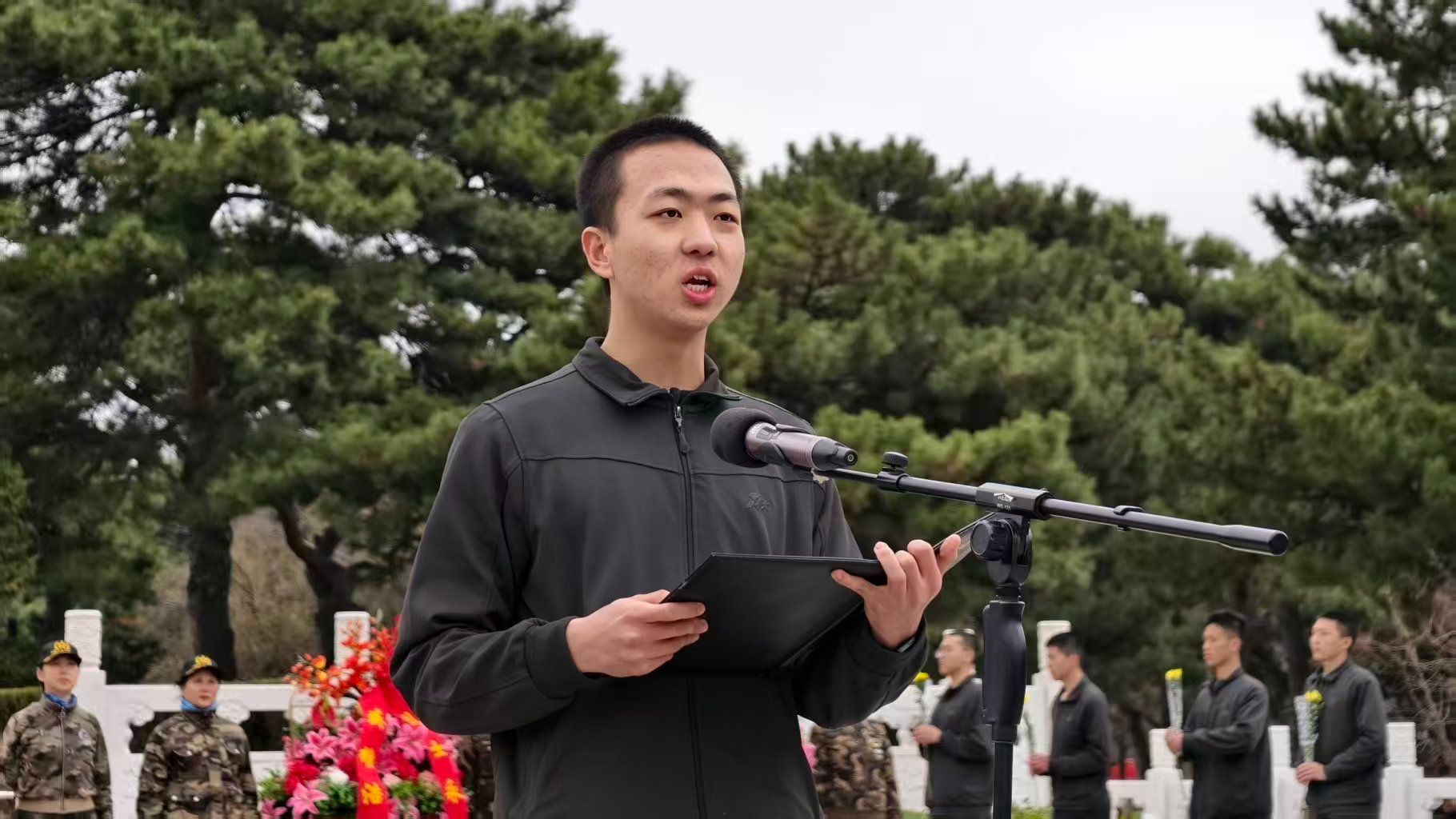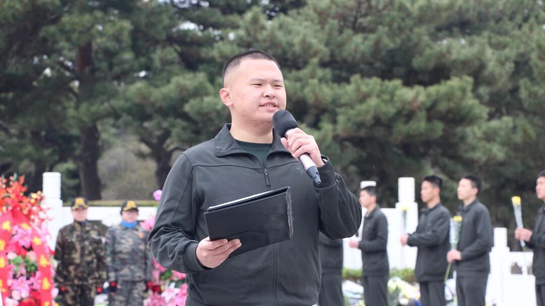 学生代表丛林领诵、全体警士生齐诵《谁是最可爱的人》,在激昂的文字中重温英烈的峥嵘岁月,感悟伟大的抗美援朝精神。最后,全体合唱《我们是共产主义接班人》。嘹亮的歌声回荡在烈士陵园上空,彰显着新时代青年传承红色基因、赓续红色血脉的坚定信念。