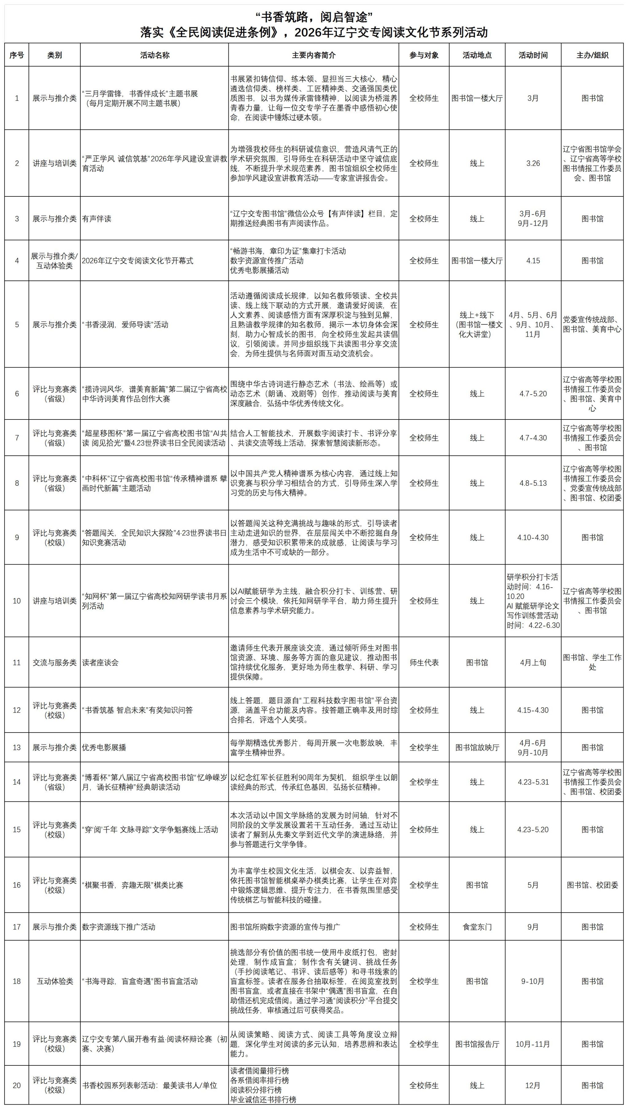 2026年阅读文化节活动详情可关注“辽宁交专图书馆”微信公众号详细了解。