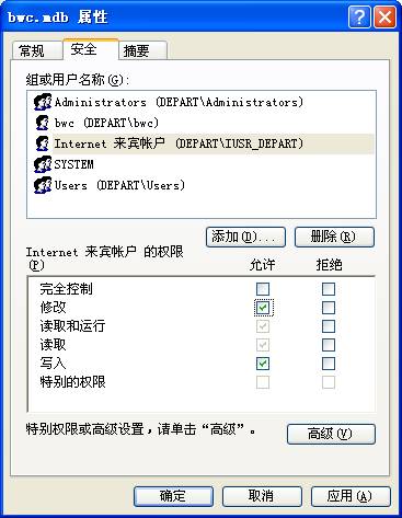 设置方法如下:找到数据库文件后,右键单击数据库文件,出现如下对话框,选择“安全“选项卡,(若无“安全”选项卡,则在浏览器菜单栏点击“工具-文件夹选项-查看”中的高级设置中,去掉“使用简单文件共享(推荐)”选勾即可),选中“Internet来宾账户”后,勾选“修改”和”写入”权限即可。