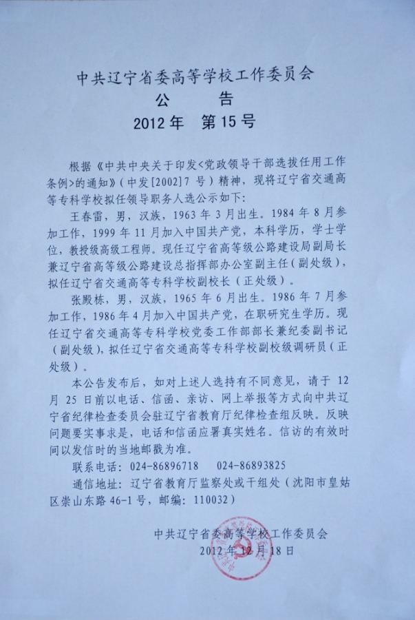 中共辽宁省委高等学校工作委员会公告2012【15号】