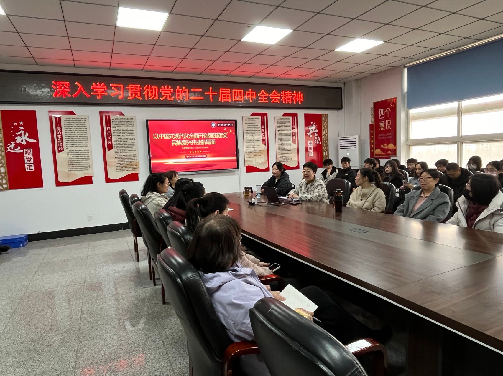11月26日下午,信息工程系党总支在综合实训楼502党员活动室召开集中学习会议,深入学习贯彻党的二十届四中全会精神。会议由信息工程系党总支书记王喜华主持,信息工程系全体教师和部分学生代表参加。