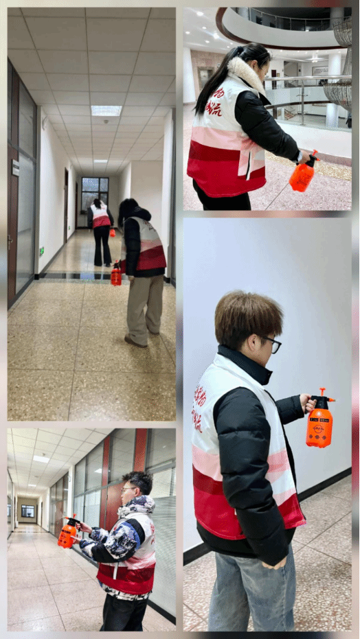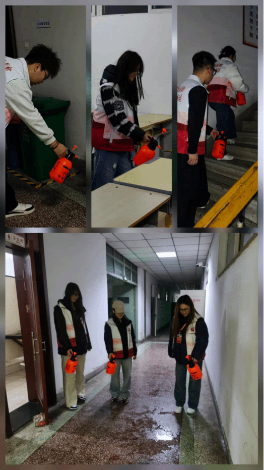 志愿者们积极行动,携带消毒用品,对办公楼和知行楼的走廊、楼梯、教室、办公室门口等公共区域进行全面消杀。在门诊部吴运利老师的专业指导下,他们严格按照规范流程,认真喷洒消毒药剂,确保消杀工作无死角、全覆盖,有效降低了病菌传播风险,为师生们营造了安全、卫生的教学办公环境。志愿者们一丝不苟、认真负责的态度,展现了当代青年大学生强烈的社会责任感和使命感。