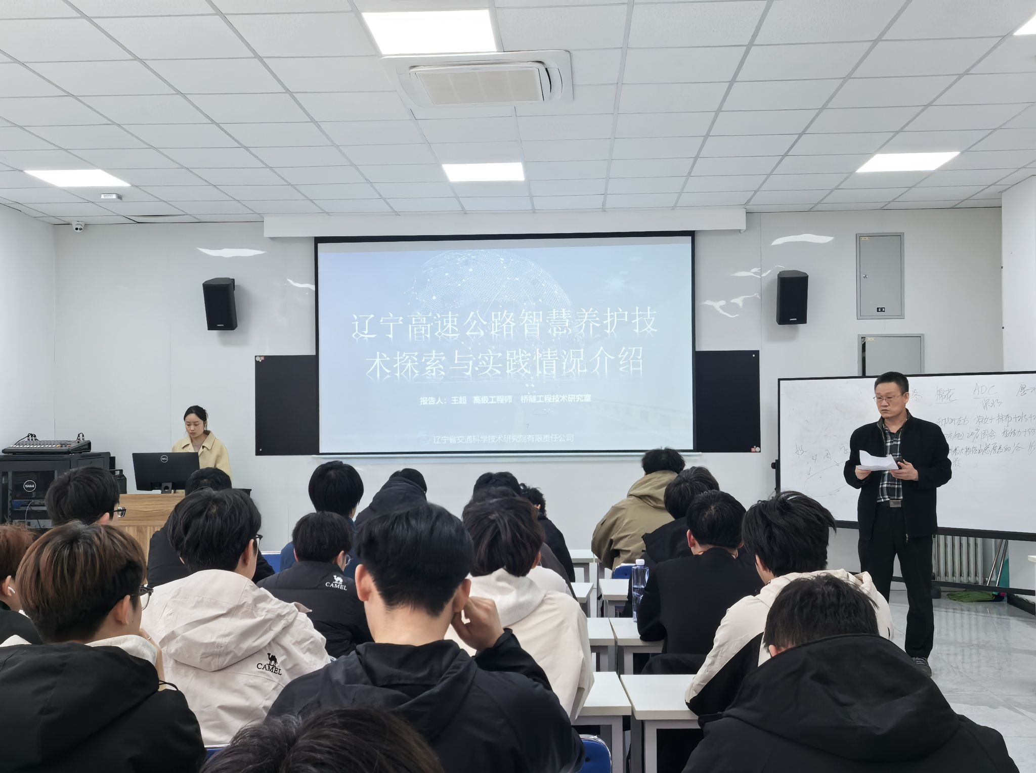 为拓宽师生专业视野、接轨行业前沿技术,助力学生专业成长与职业发展,近日,公路与铁道工程系特邀辽宁省交通科学研究院有限责任公司高级工程师王超博士,在公铁楼2003教室开展“辽宁高速公路智慧养护技术探索与实践”专题学术报告。本次报告会由王海兴老师主持,公路与铁道工程系道路工程检测专业共计76名师生到场聆听学习。