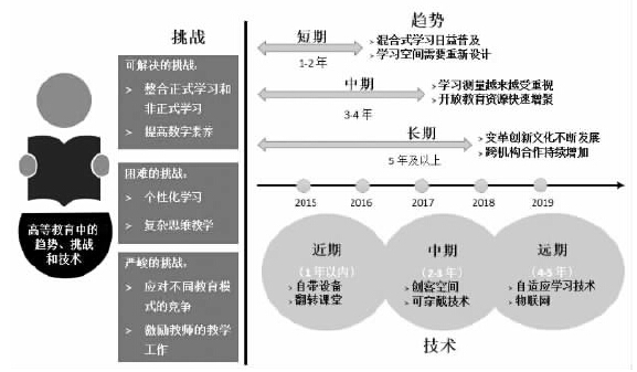由新媒体联盟(NMC)与美国高校教育信息化协会(ELI)合作完成的《新媒体联盟地平线报告:2015高等教育版》(以下简称《地平线报告》)在近期发布,该报告依据17个国家56位专家的投票结果,预测了2015年至2019年加速高等教育技术采用的关键趋势、阻碍高等教育技术采用的重要挑战以及高等教育中教育技术应用的重要进展。