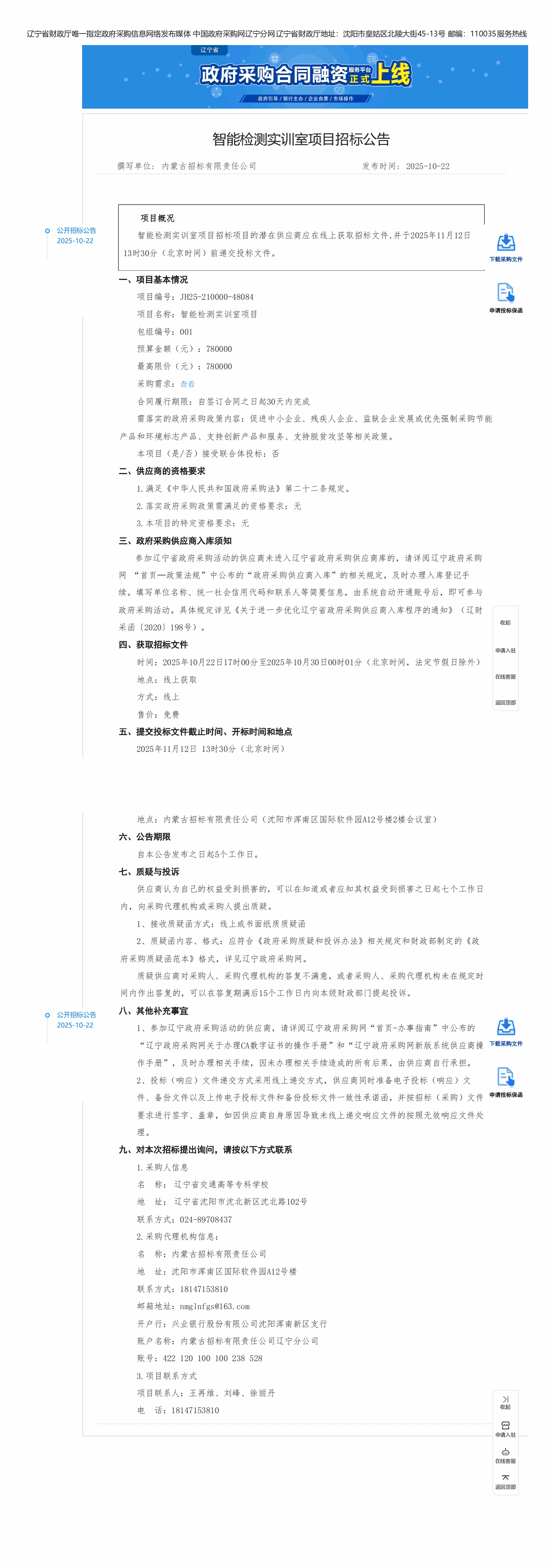 智能检测实训室项目招标公告(LNCC2025132)