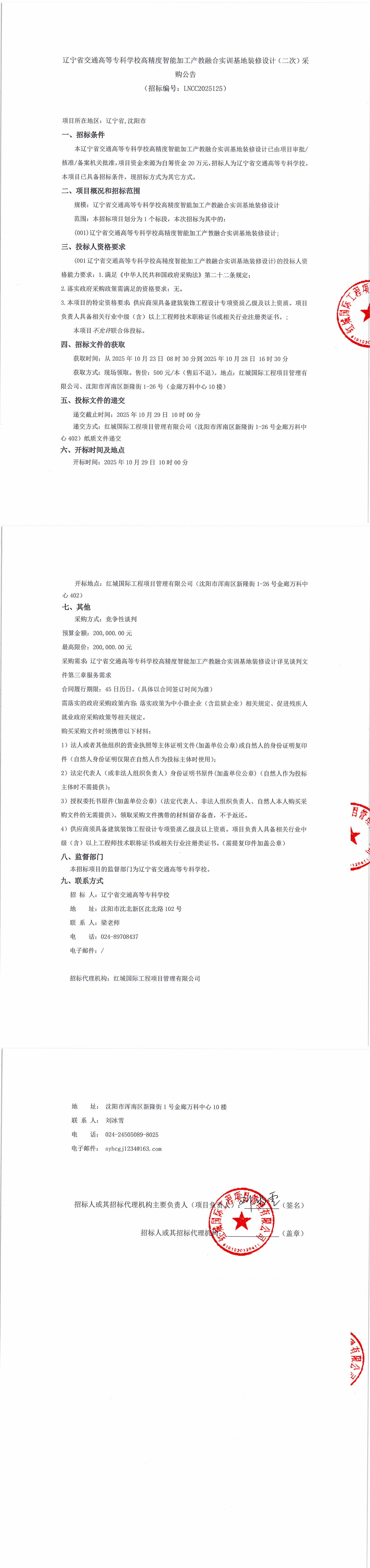 辽宁省交通高等专科学校高精度智能加工产教融合实训基地装修设计(二次)采购公告(LNCC2025125)