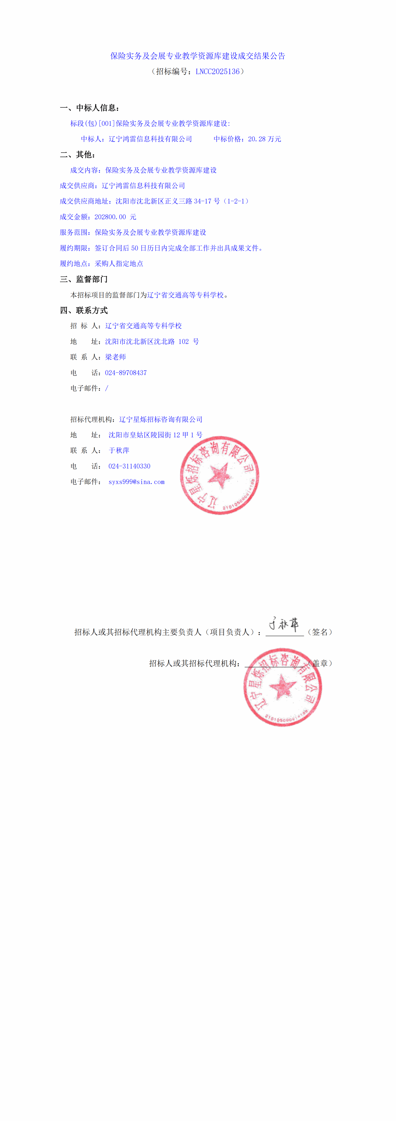 保险实务及会展专业教学资源库建设成交结果公告(LNCC2025136)