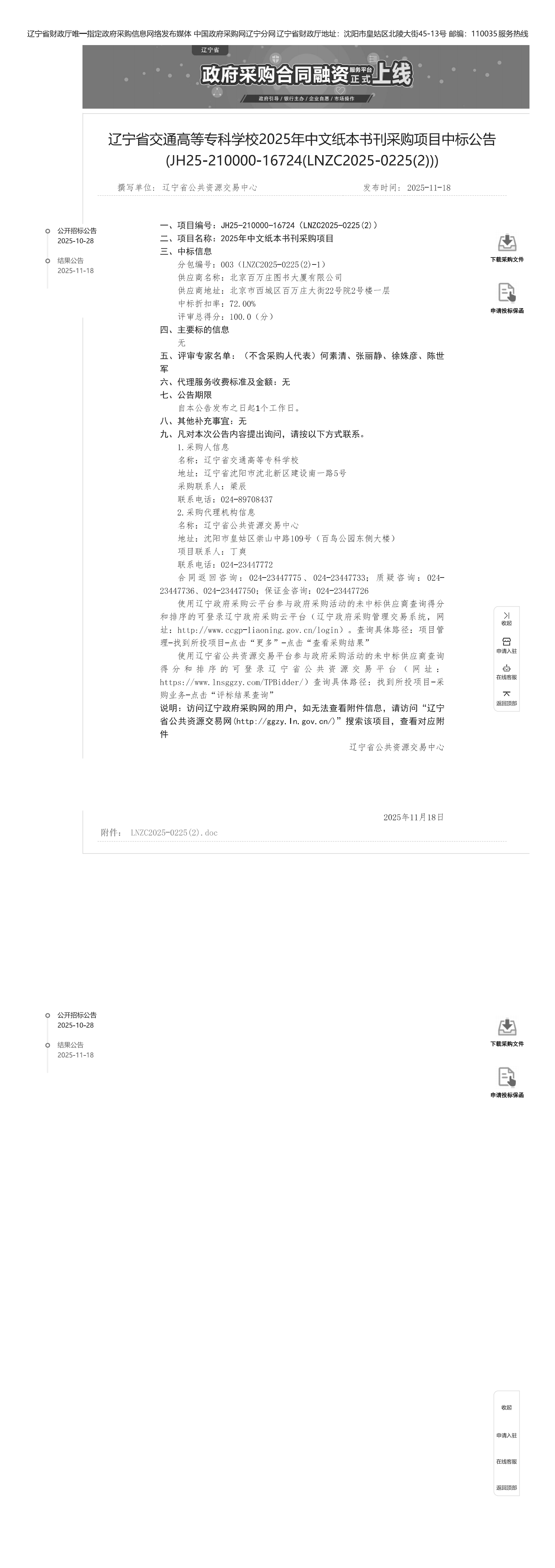 辽宁省交通高等专科学校2025年中文纸本书刊采购项目中标公告(LNCC2025072)