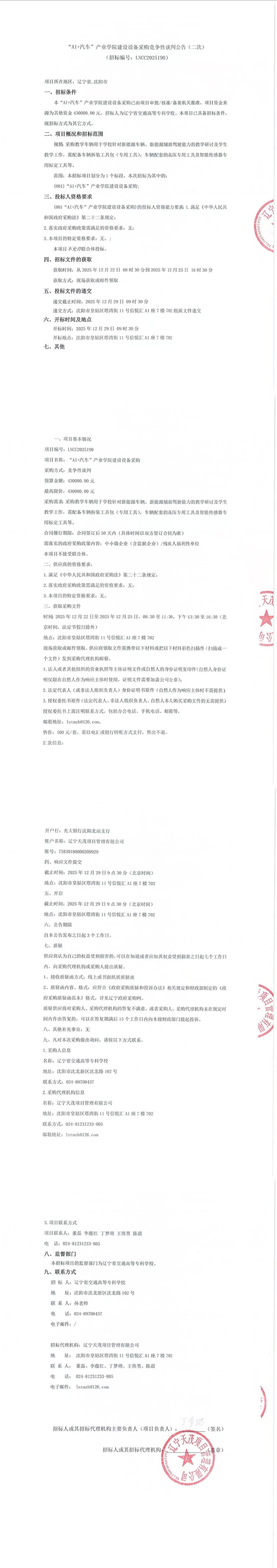 “AI+汽车”产业学院建设设备采购竞争性谈判公告(二次)(LNCC2025190)