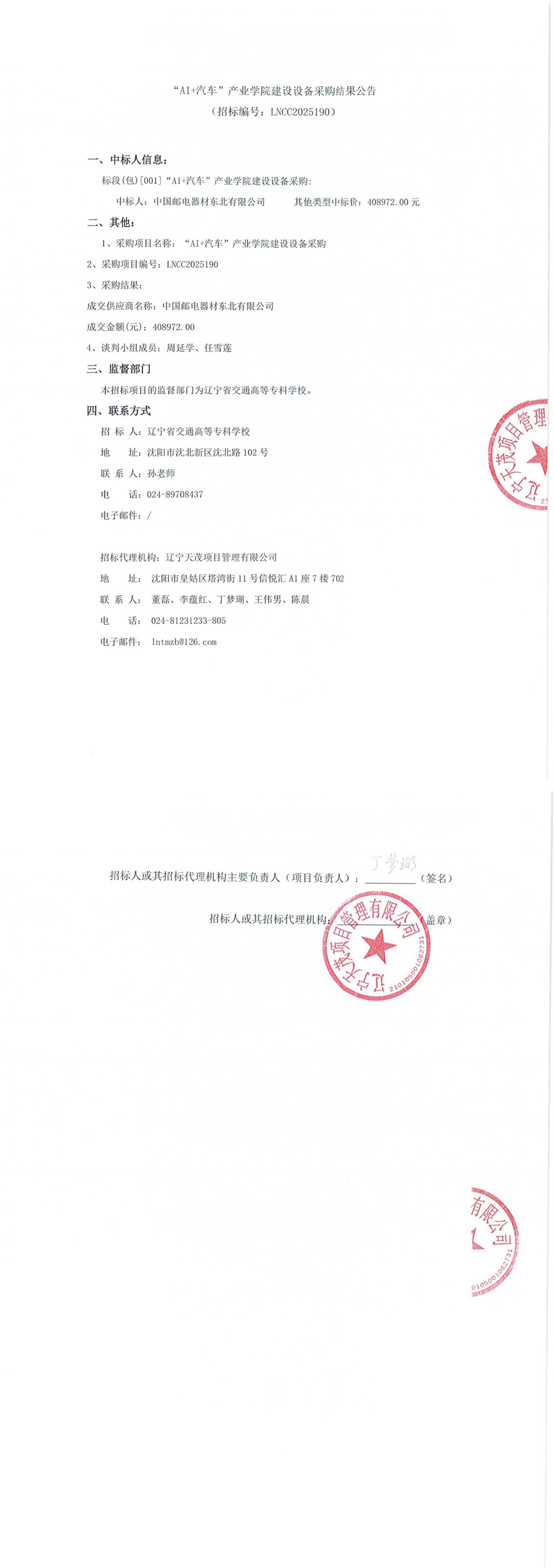 “AI+汽车”产业学院建设设备采购结果公告(LNCC2025190)
