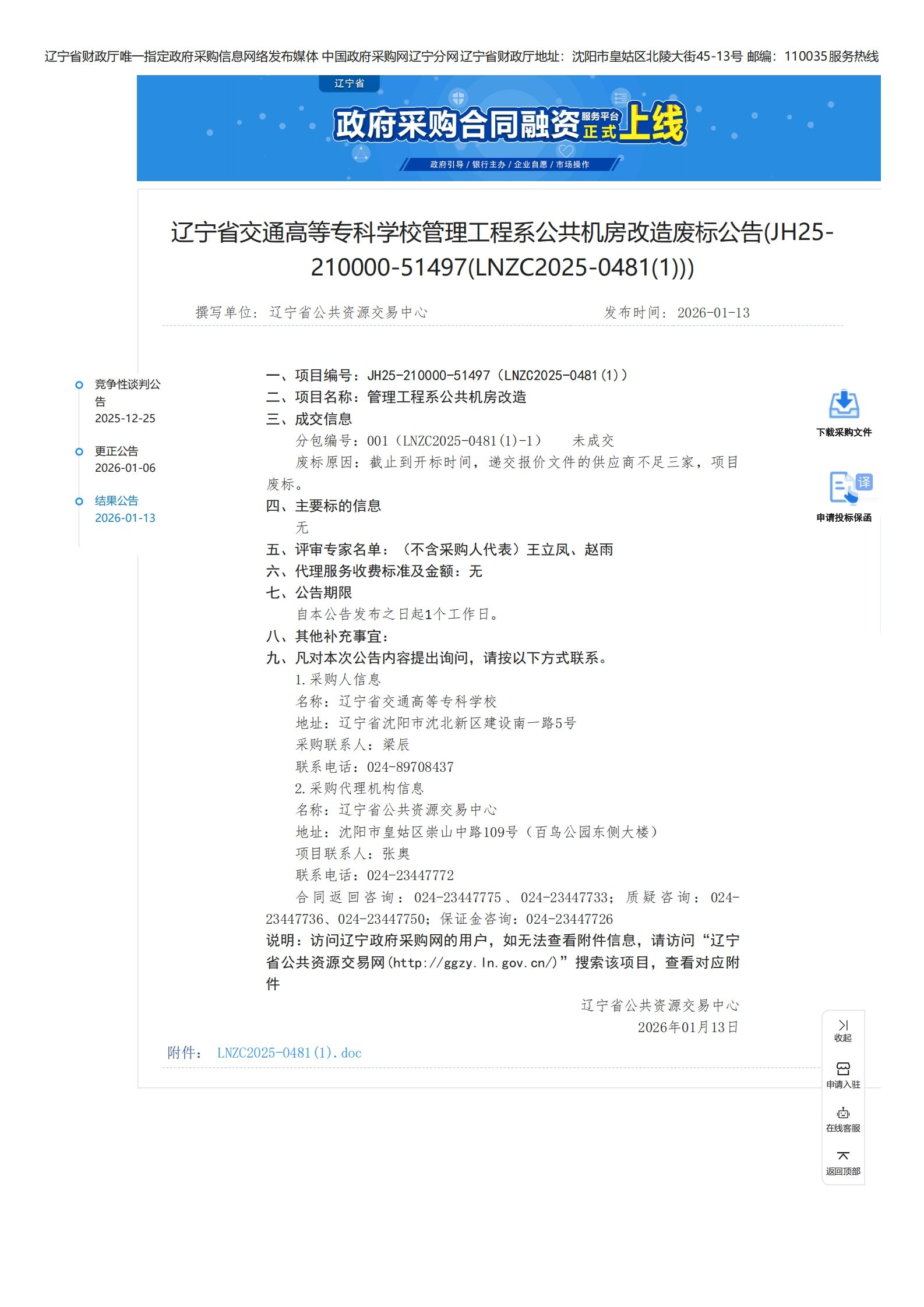 辽宁省交通高等专科学校管理工程系公共机房改造废标公告