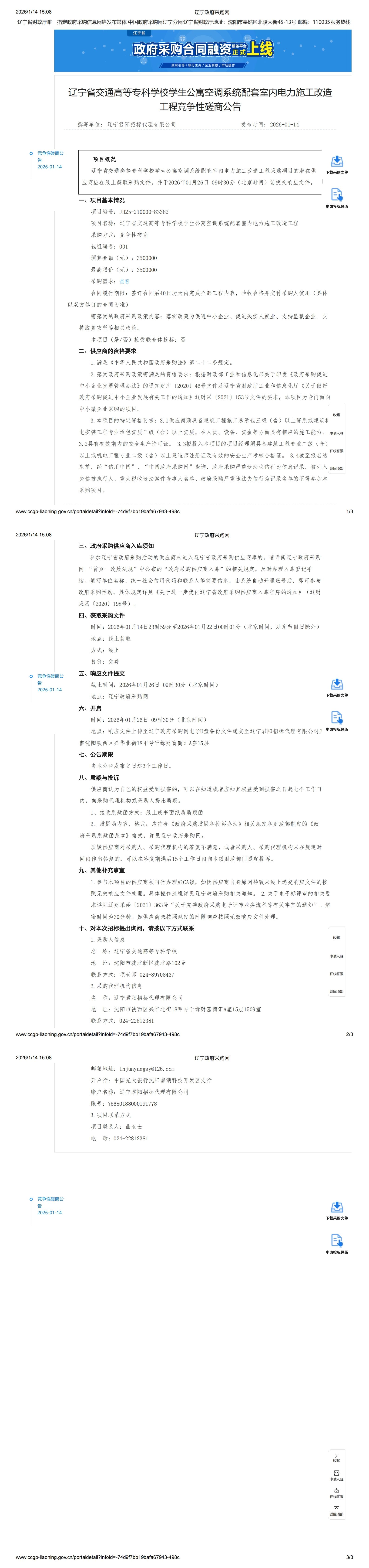 辽宁省交通高等专科学校学生公寓空调系统配套室内电力施工改造工程竞争性磋商公告