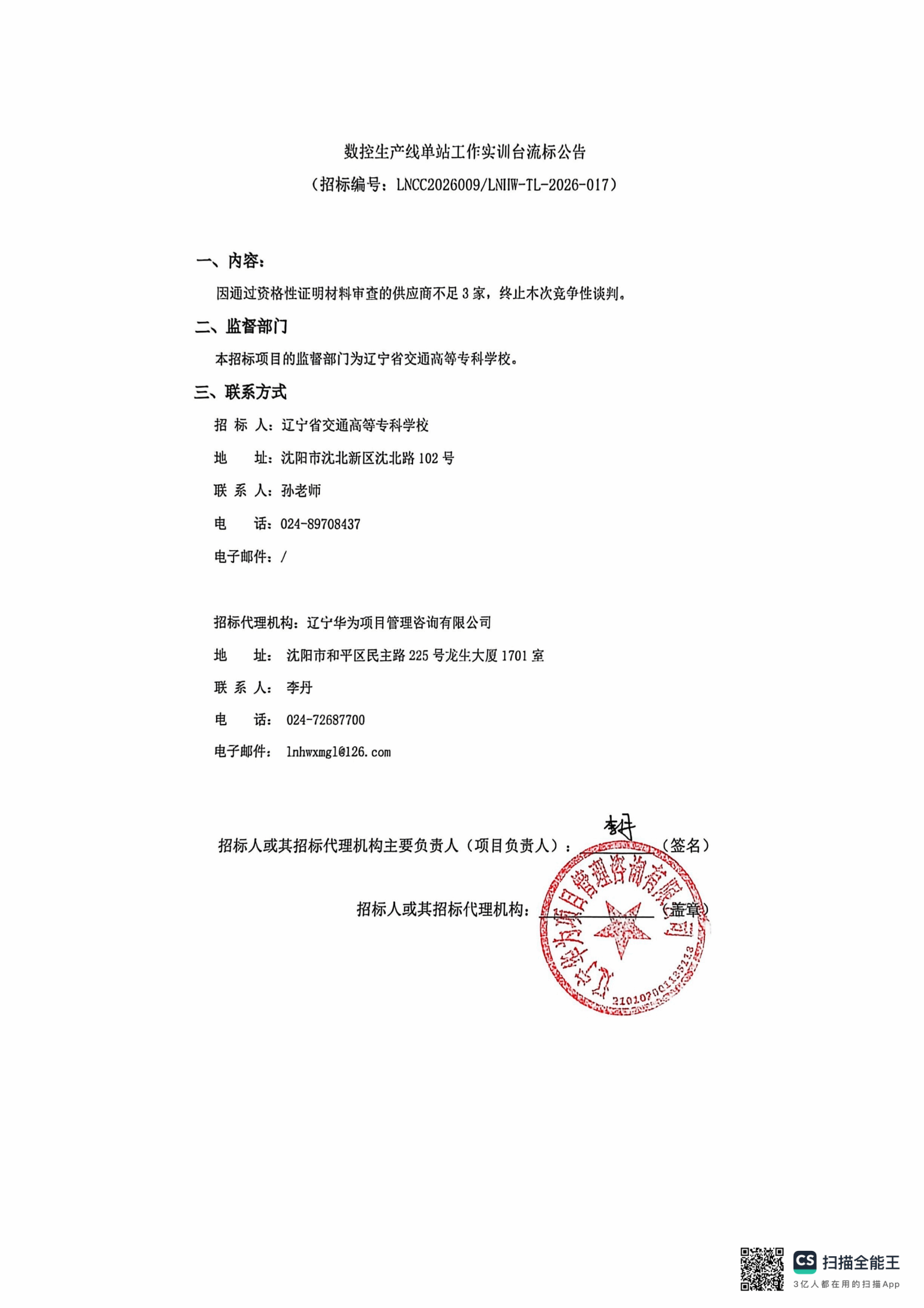 数控生产线单站工作实训台流标公告