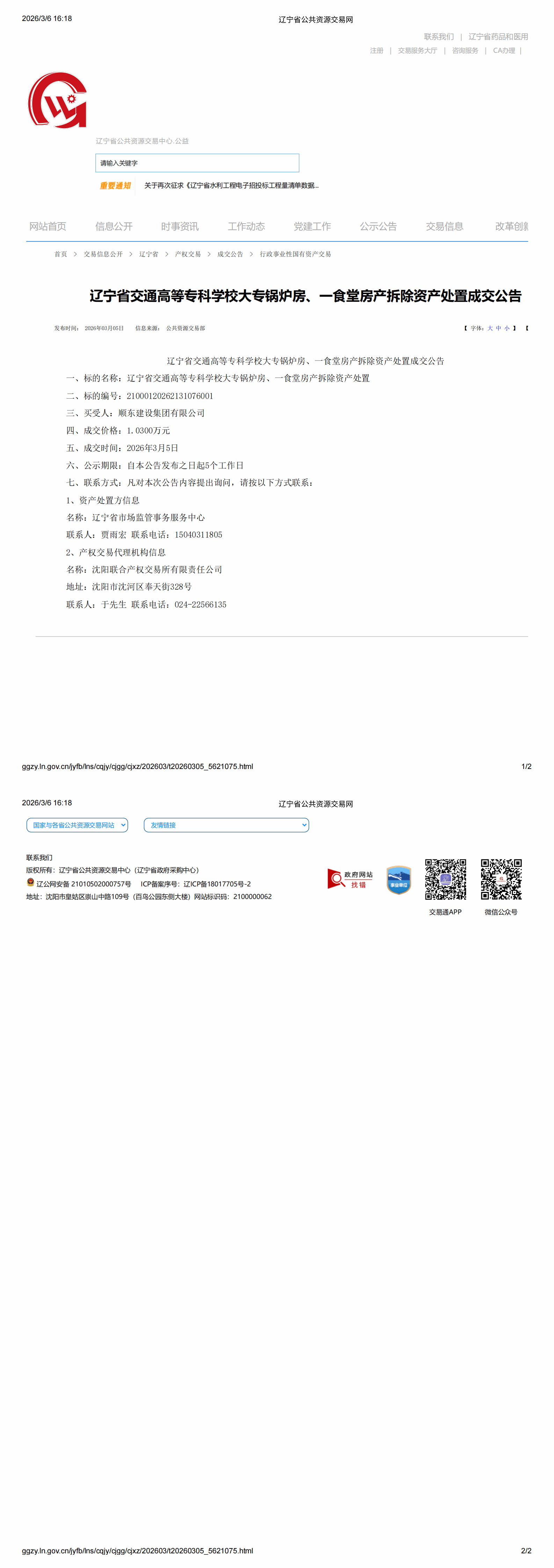 辽宁省交通高等专科学校大专锅炉房、一食堂房产拆除资产处置成交公告
