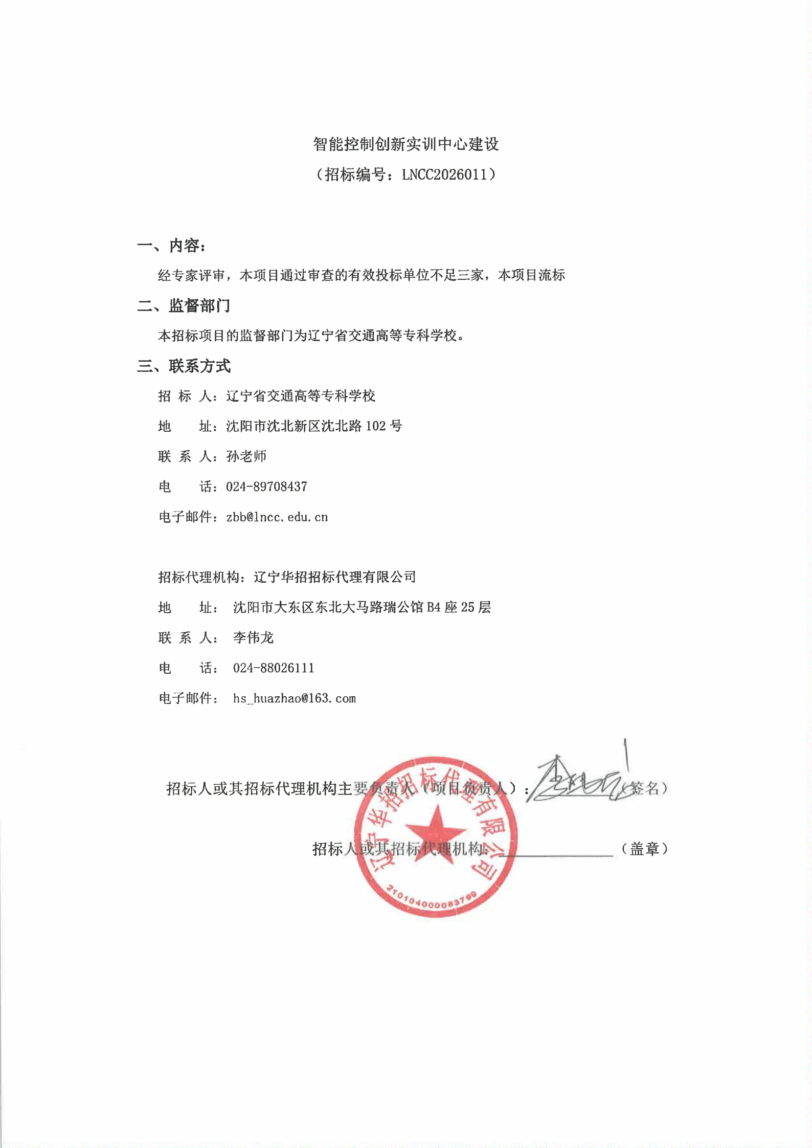 智能控制创新实训中心建设项目流标公告(LNCC2026011)