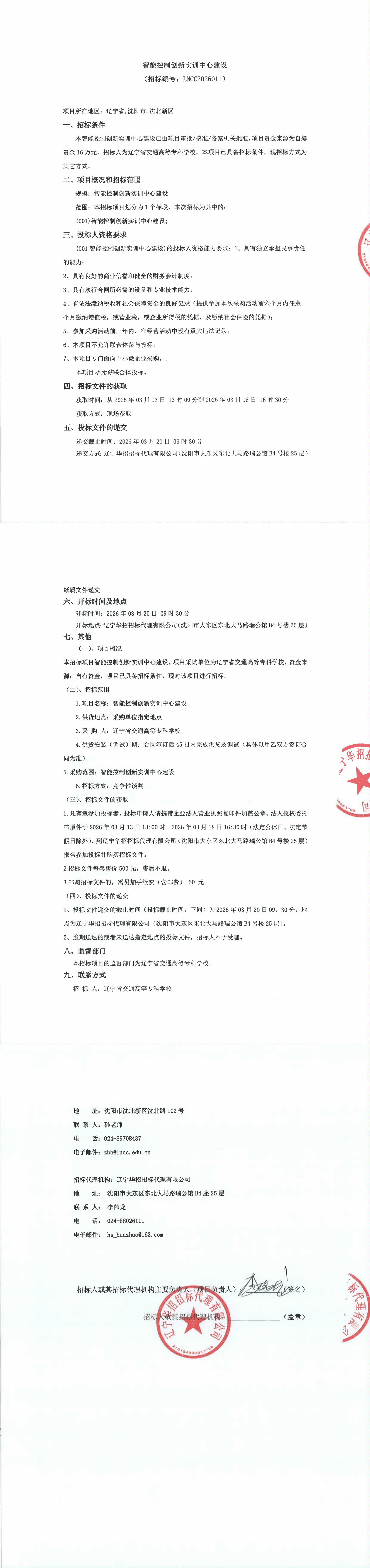 智能控制创新实训中心建设采购公告(二次公告)(LNCC2026011)