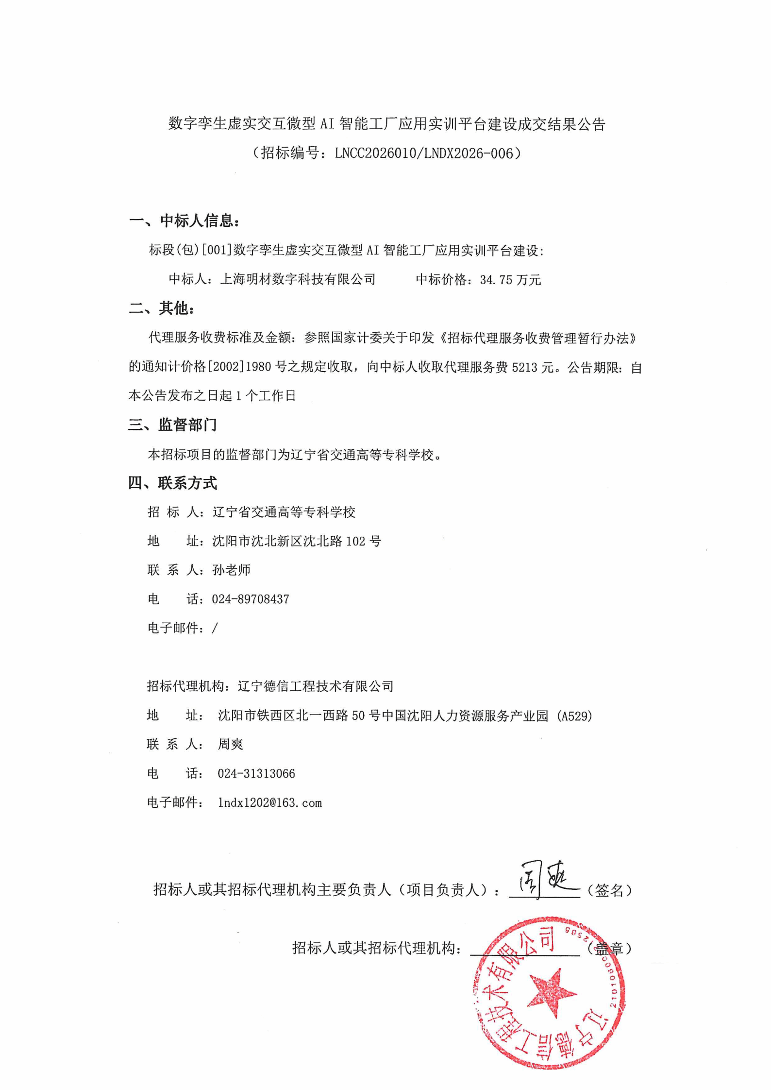数字孪生虚实交互微型AI智能工厂应用实训平台建设采购结果公告(LNCC2026010)