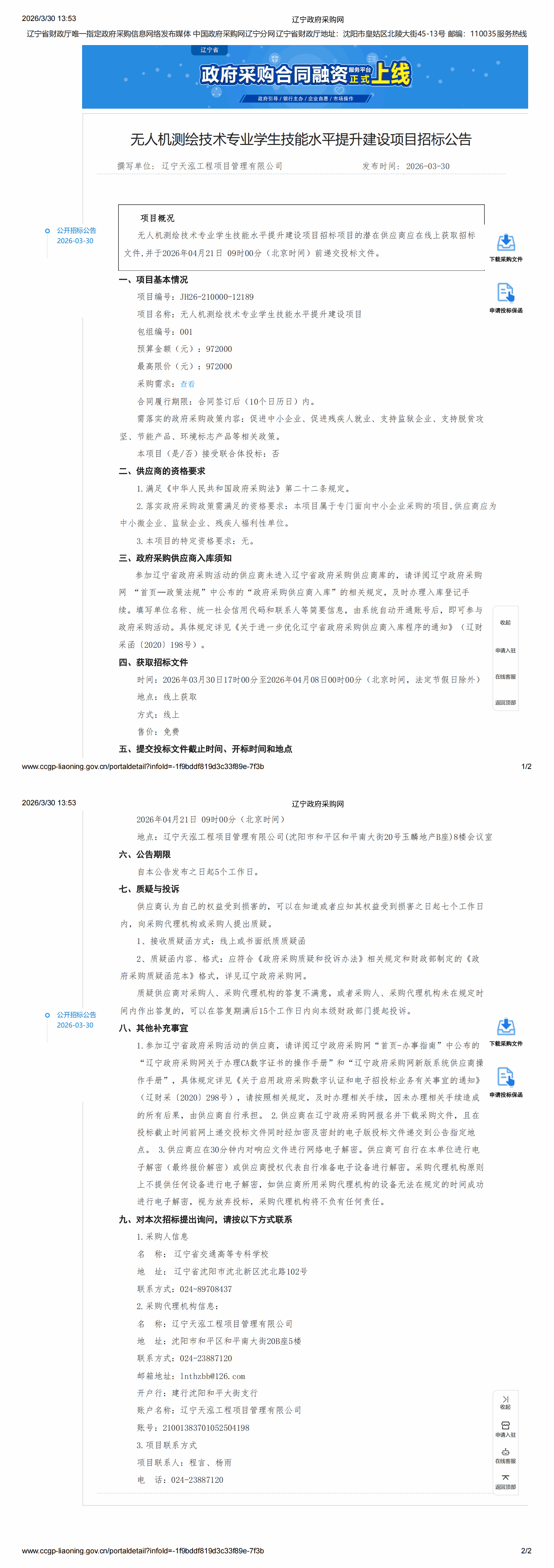 无人机测绘技术专业学生技能水平提升建设项目招标公告