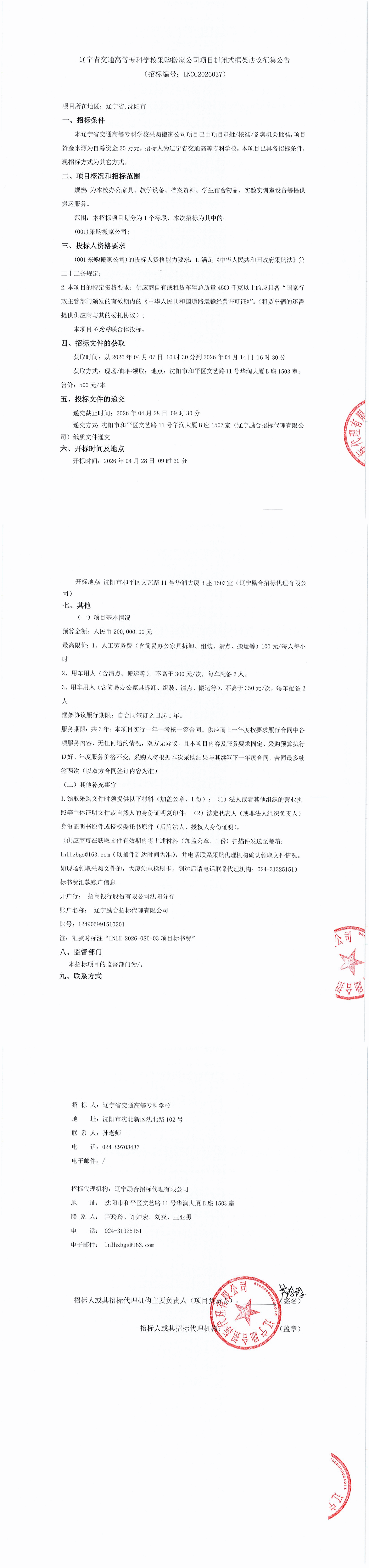 采购搬家公司项目封闭式框架协议征集公告(LNCC2026037)