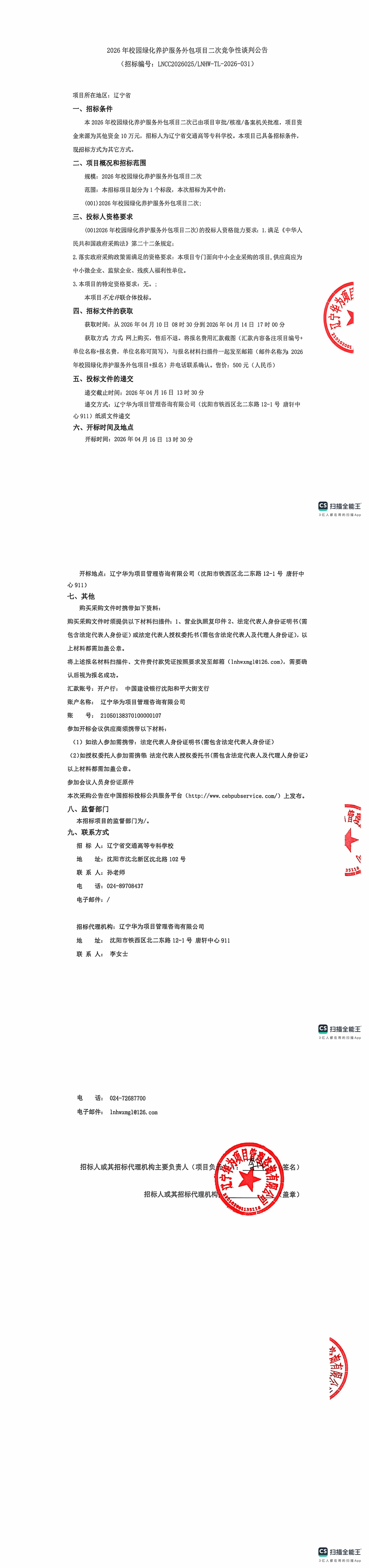 2026年校园绿化养护服务外包项目采购公告(二次)(LNCC2026025)