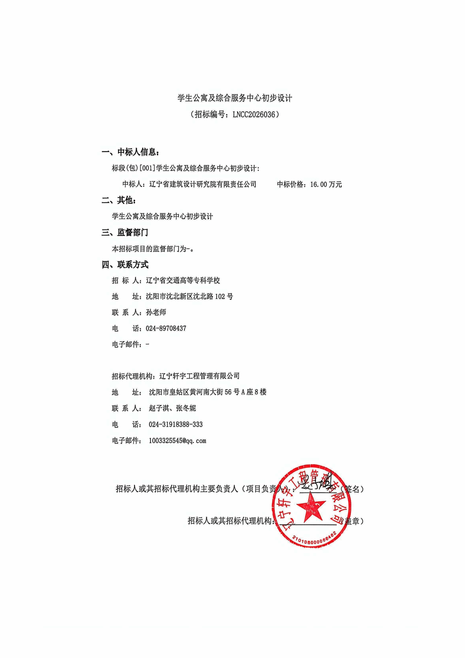 学生公寓及综合服务中心初步设计招标项目采购结果公告(LNCC2026036)