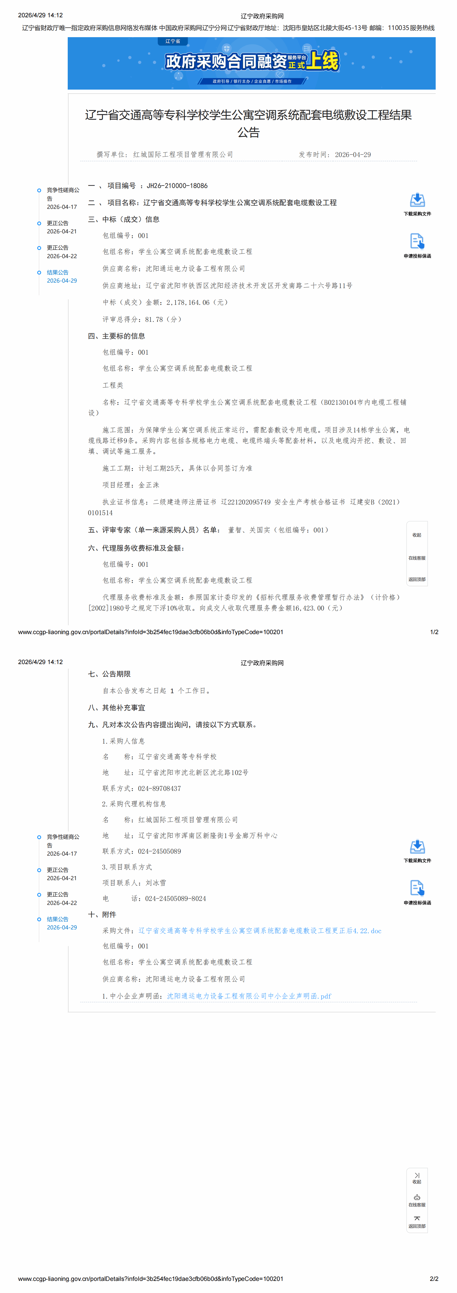 辽宁省交通高等专科学校学生公寓空调系统配套电缆敷设工程结果公告